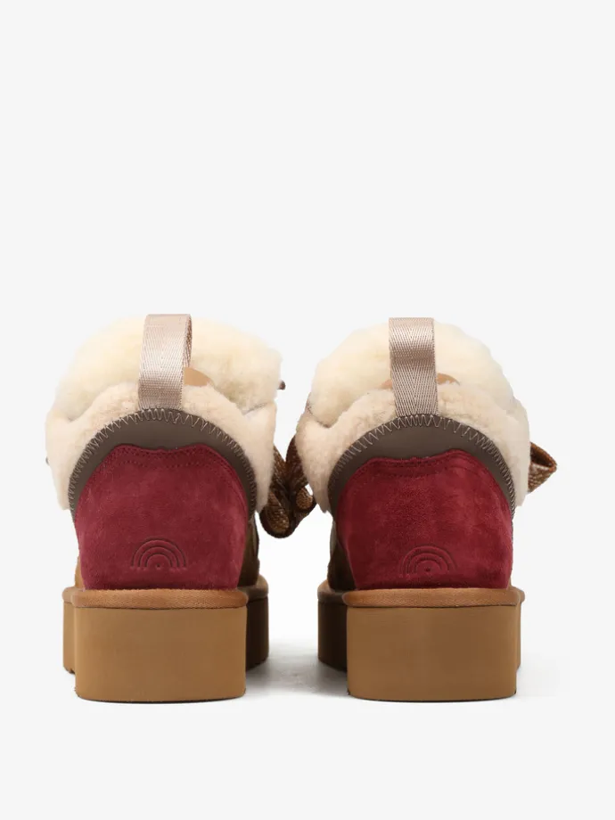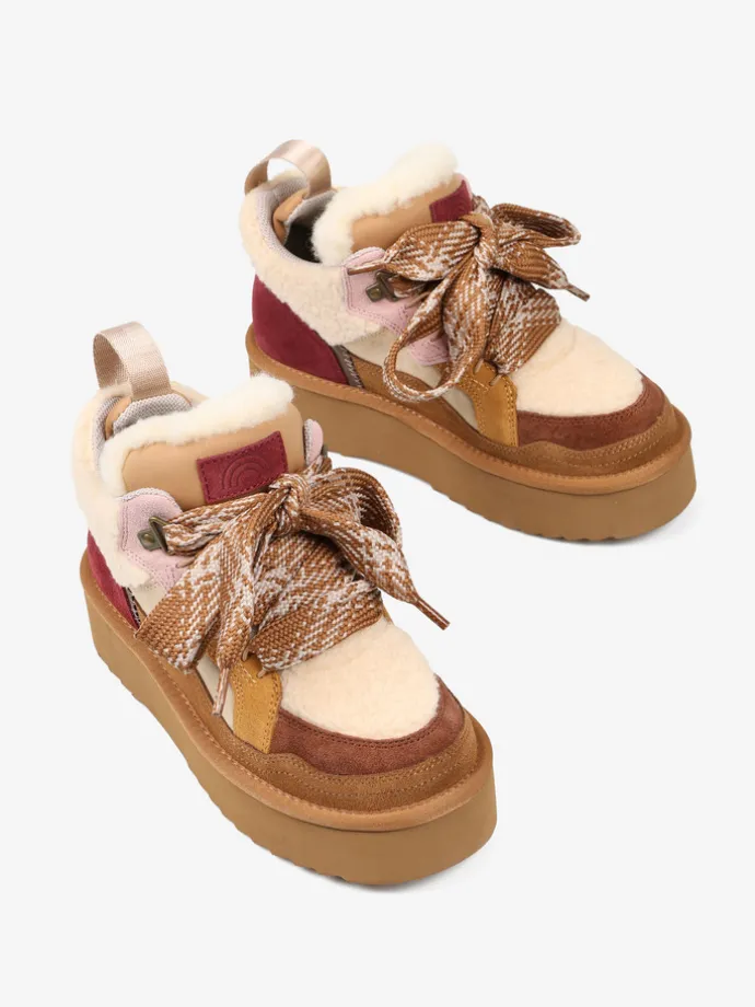Sneakersy na platformie z wielobarwnego połączenia zamszu i tkaniny imitującej futro baranka.