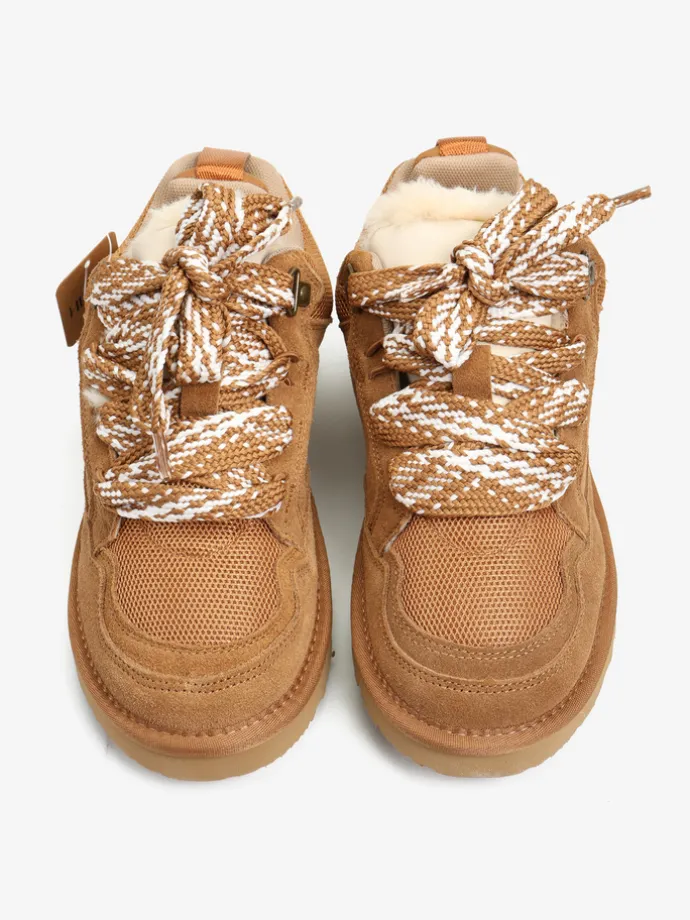 Zamszowe sneakersy z przeszyciami z siateczki. Wnętrze butów wyłożone miękką tkaniną imitującą futro baranka.