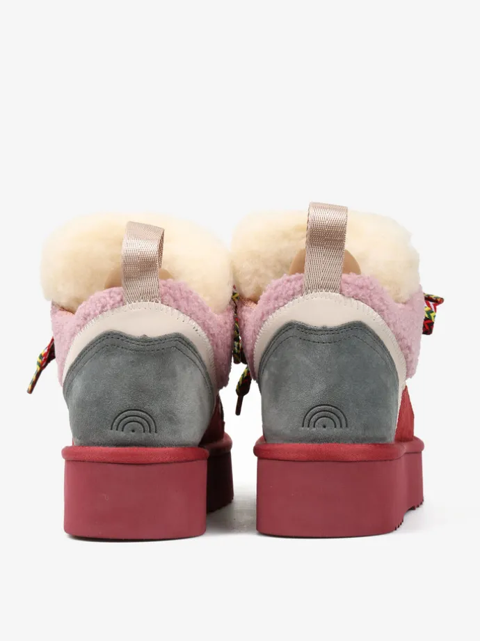 Sneakersy na platformie z wielobarwnego połączenia zamszu i tkaniny imitującej futro baranka.