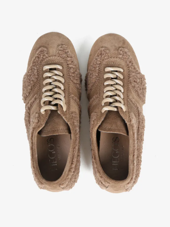 Miękkie, lekkie, beżowe sneakersy wykonane z zamszu i tkaniny imitującej futro baranka.