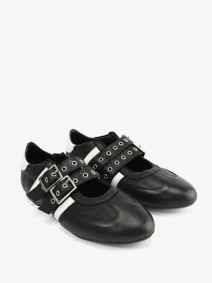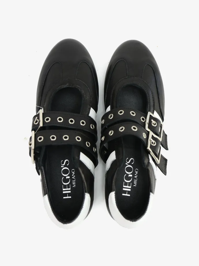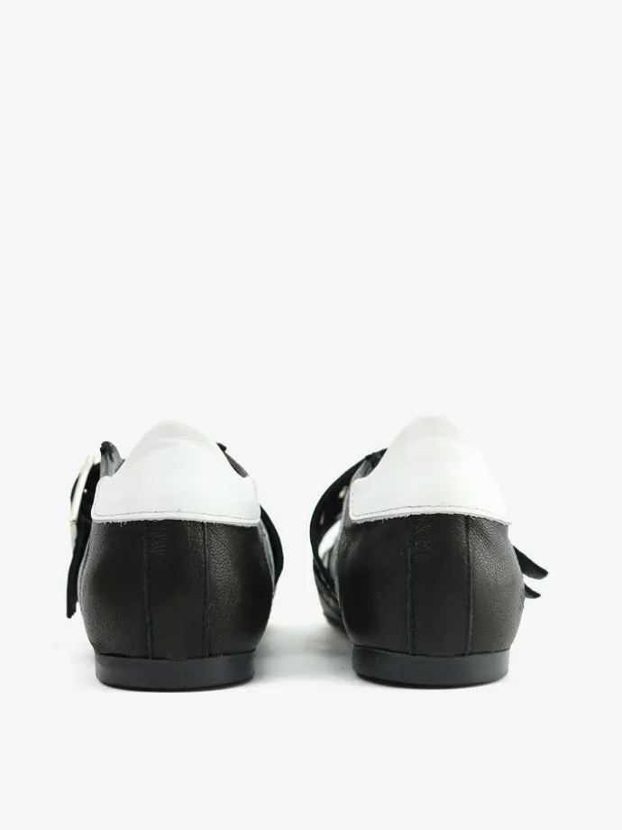 Skórzane sneakersy z głębokim wycięciem, dwoma regulowanymi paskami i białymi przeszyciami.