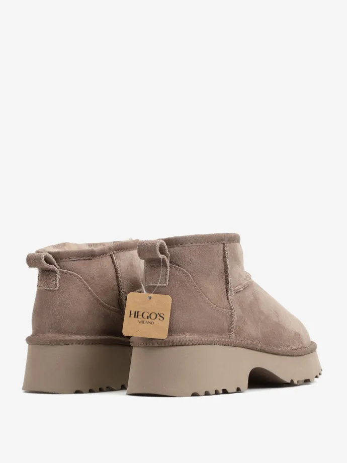 Krótkie śniegowce na wyprofilowanej platformie, wykonane z 100% naturalnej skóry owczej. Zewnętrzna warstwa to miękka, zamszowa skóra, natomiast wnętrze to ciepły, naturalny kożuch.