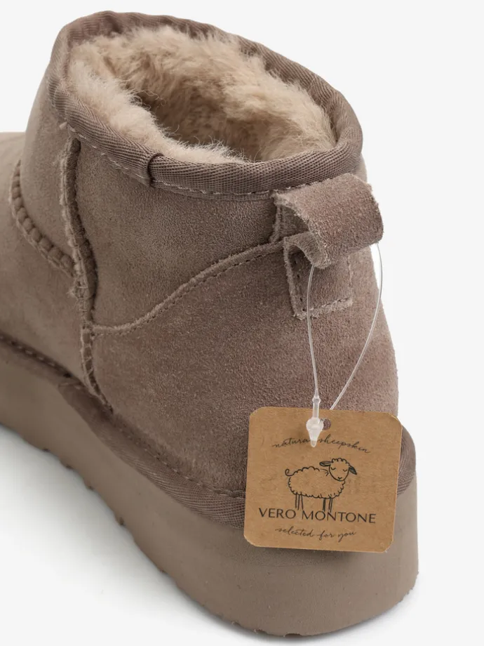 Krótkie śniegowce na średniej platformie, wykonane z 100% naturalnej skóry owczej. Zewnętrzna warstwa to miękka, zamszowa skóra, natomiast wnętrze to ciepły, naturalny kożuch.