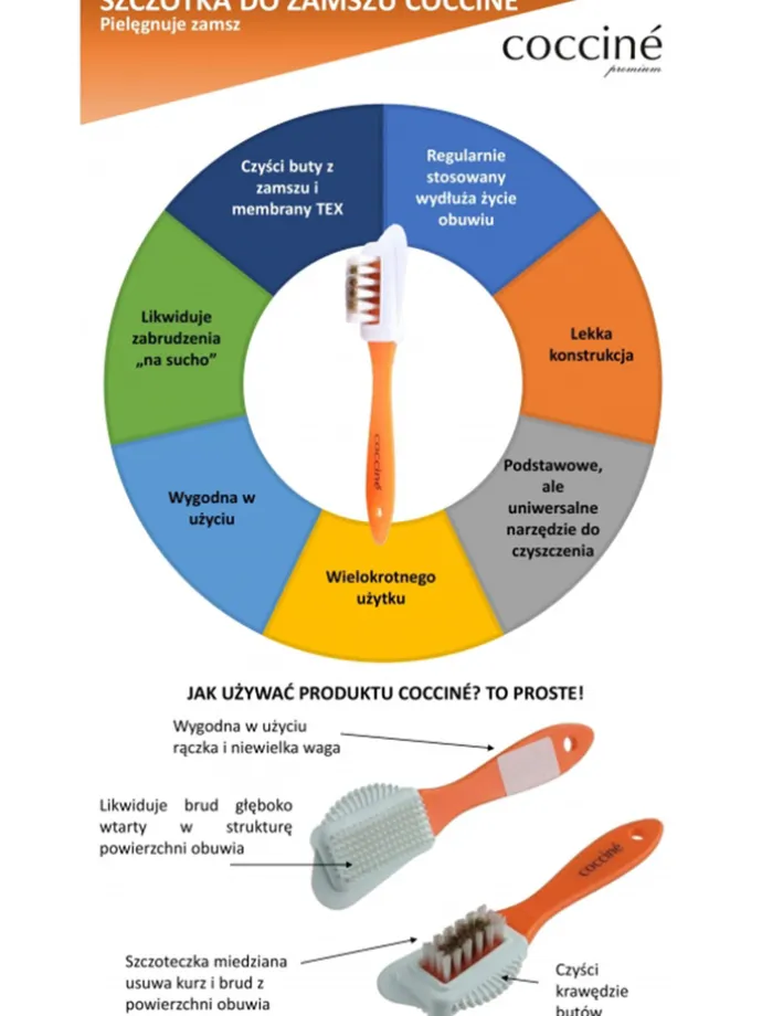 Szczoteczka do czyszczenia zamszu i nubuku to podstawowe narzędzie do pielęgnacji skóry zamszowej i nubuków, a także butów tekstylnych, obić z alcantary itp. Z jednej strony gumka do wycierania brudu, z drugiej – mieszane włosie nylonowe i miedziane do wyczesywania kurzu i zlepionego włosia. Z boku dodatkowy płatek gumowy do czyszczenia brudu nagromadzonego w szparach przy szwach i łączeniach cholewki z podeszwą.