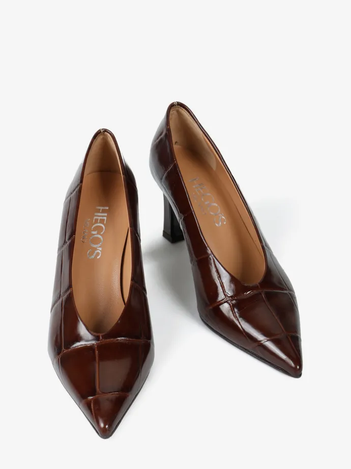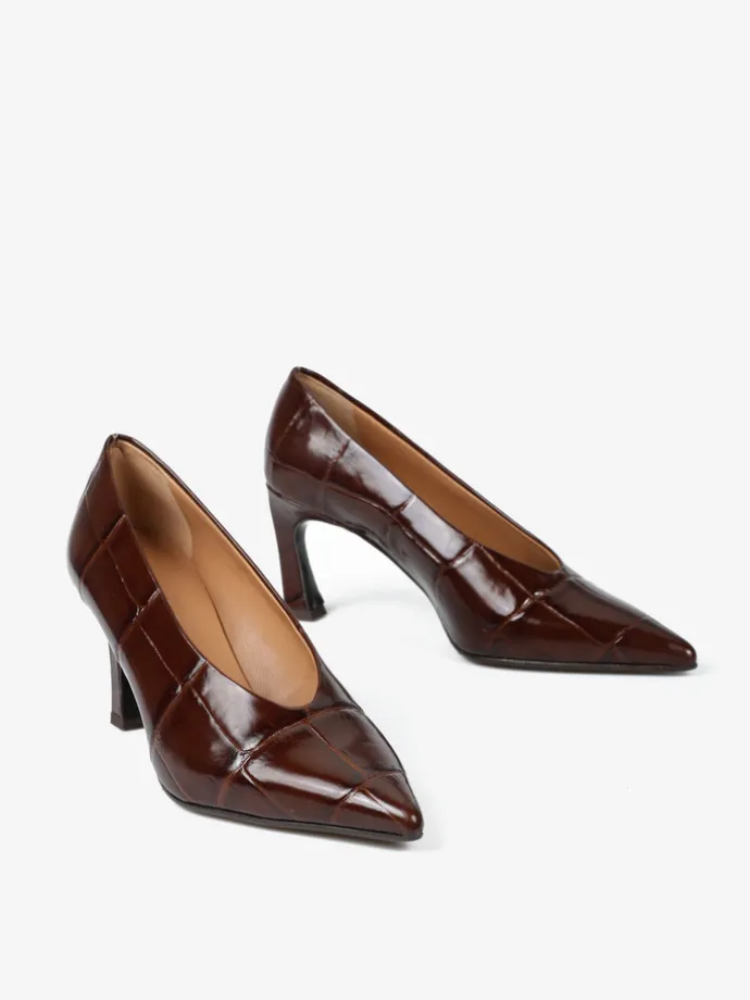 Szpilki z noskiem w szpic, wykonane ze skóry tłoczonej w krokodyli wzór. Owalne wycięcie z zabudowanymi brzegami.