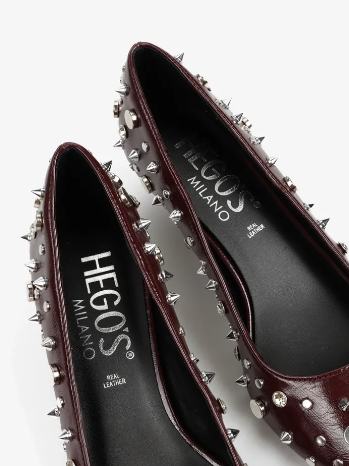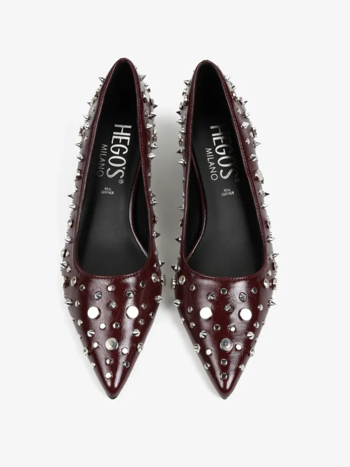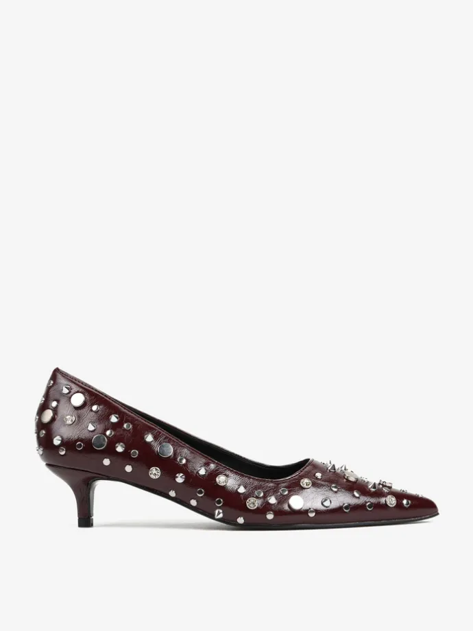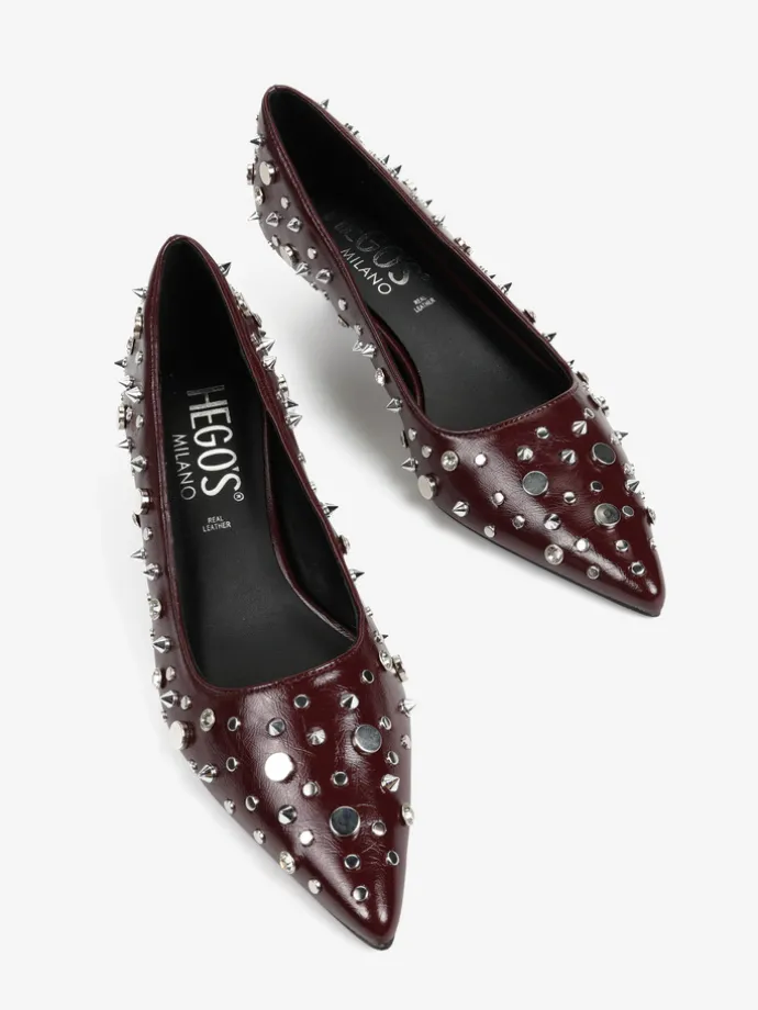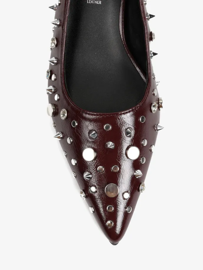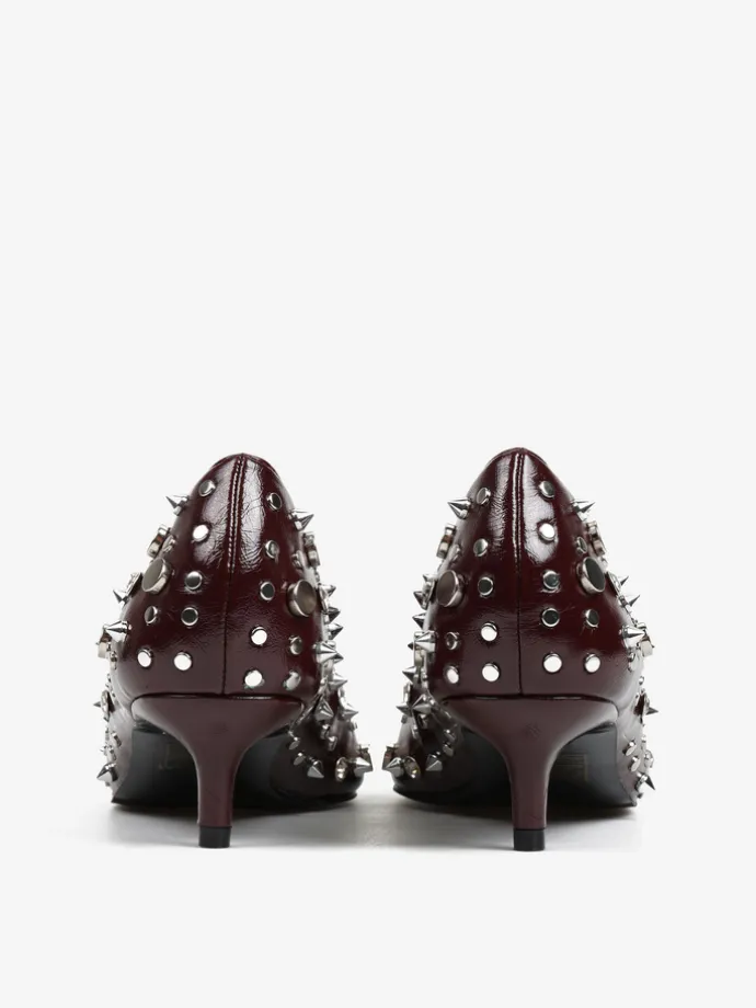 Niskie szpilki z noskami w szpic i kwadratowym wycięciem. Zdobienia z ćwieków o różnych kształtach i rozmiarach.