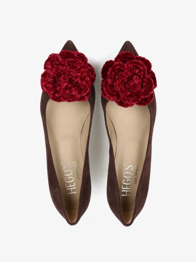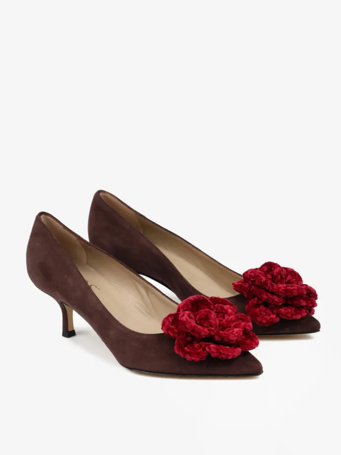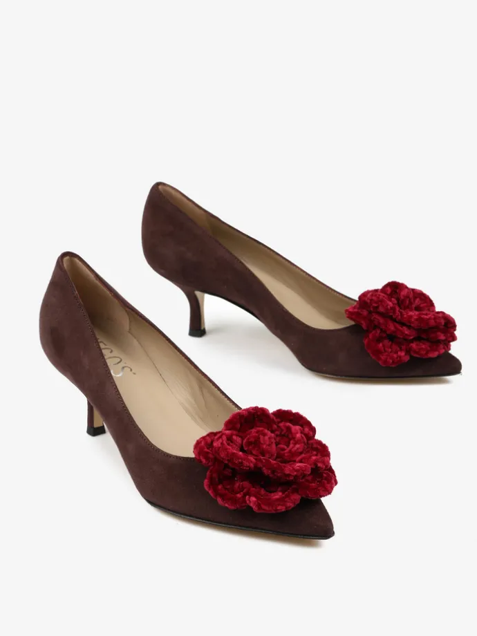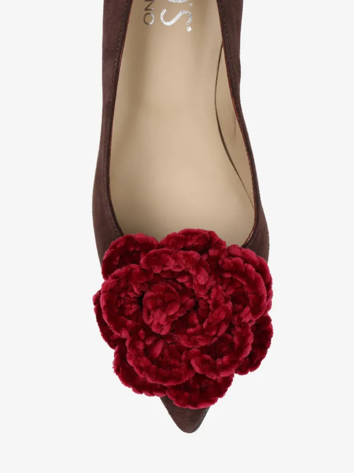 Zamszowe szpilki z noskiem w szpic ozdobione szydełkowym, bordowym kwiatem.