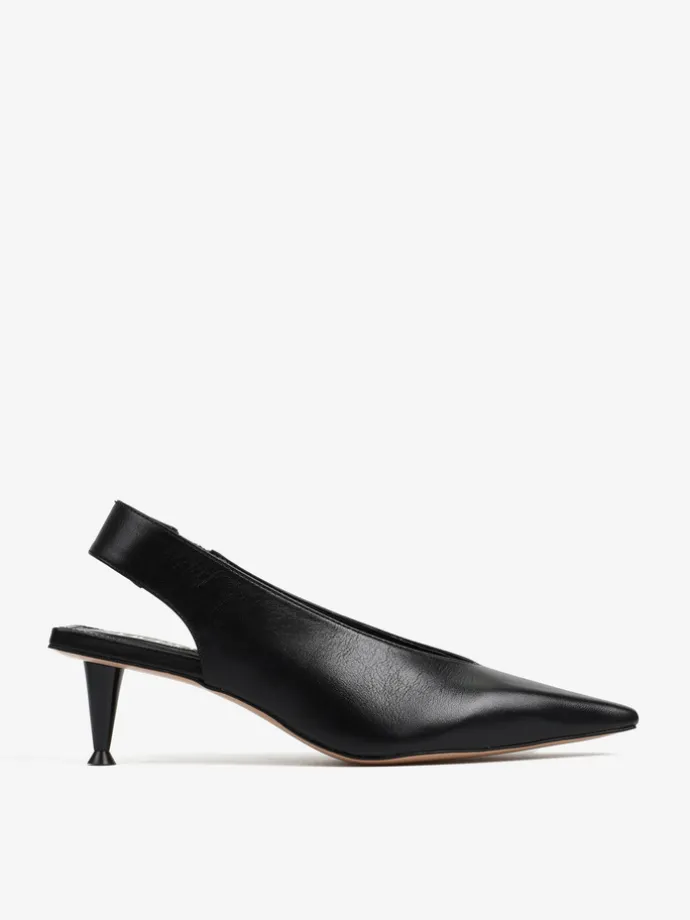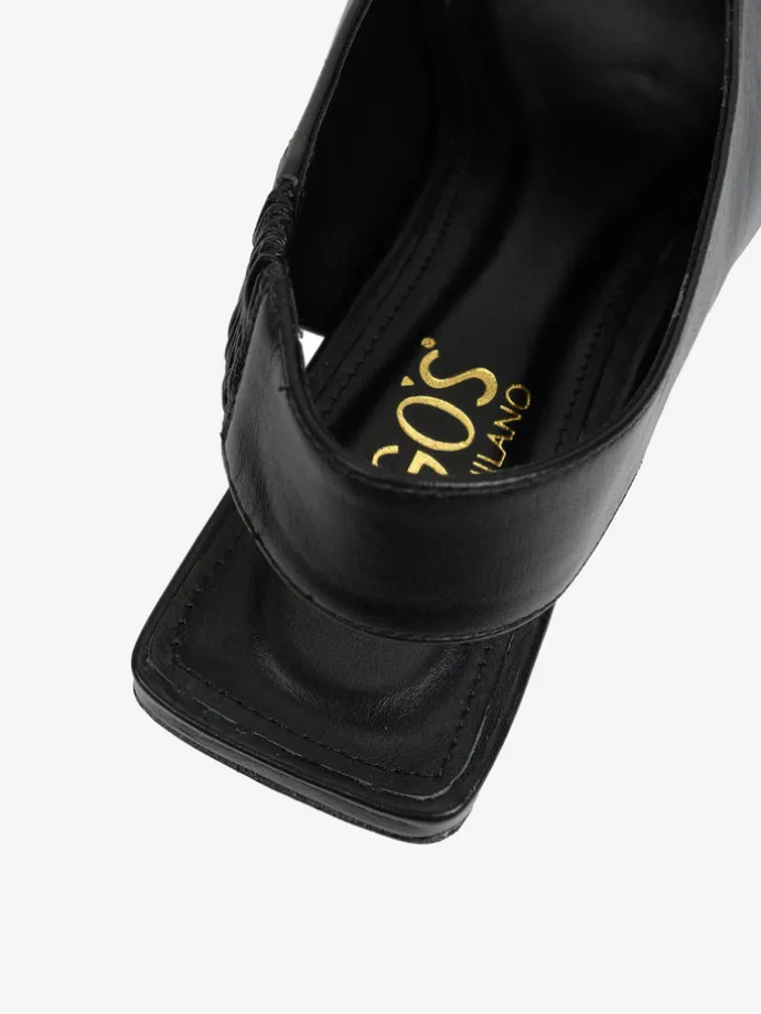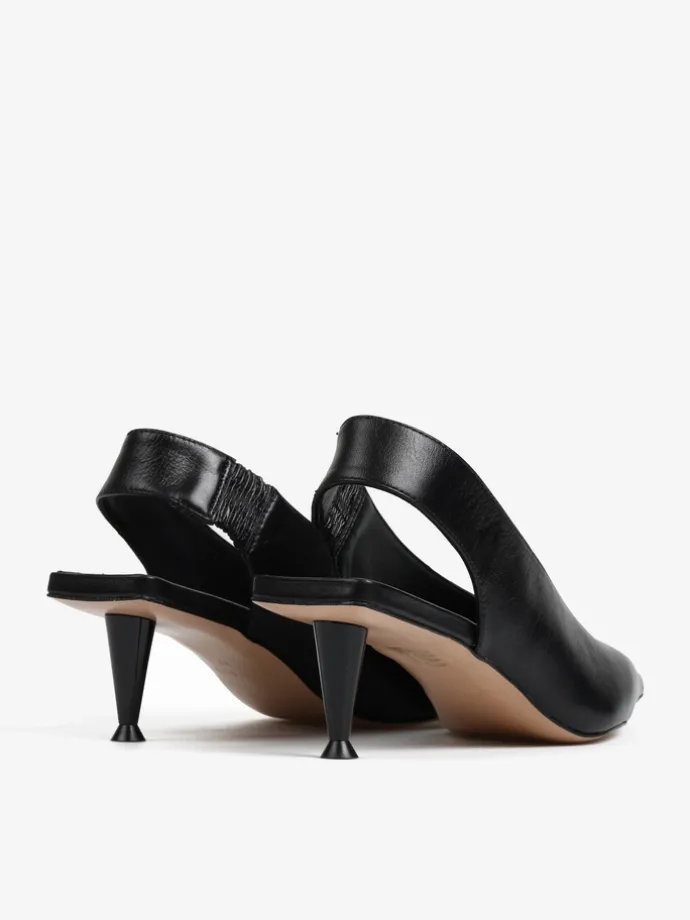 Szpilki z geometrycznym obcasem i wydłużonymi noskami w szpic. Odkryta pięta z elastycznym paskiem.