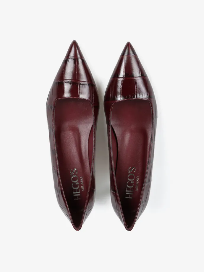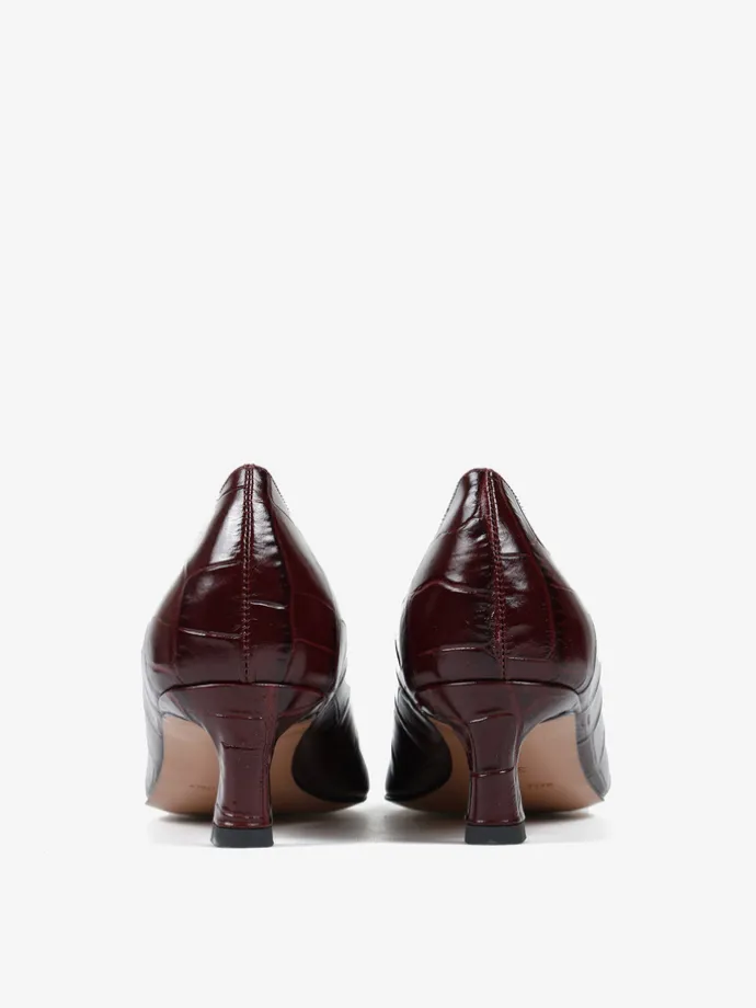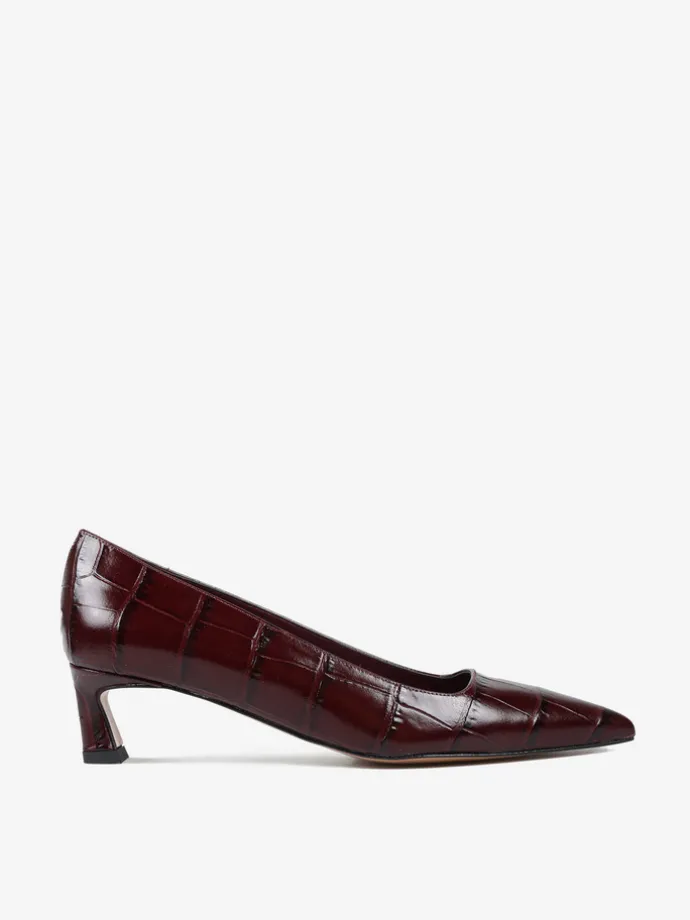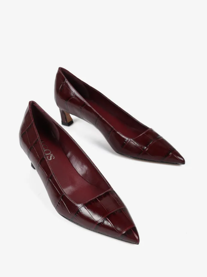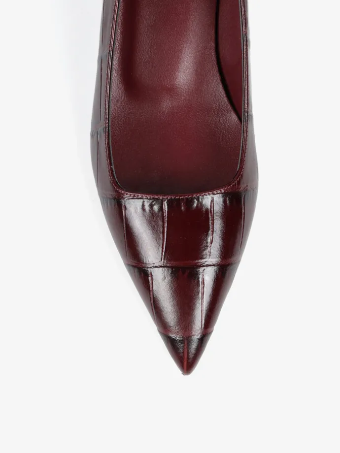 Niskie szpilki wykonane ze skóry w krokodyli wzór. Kwadratowe wycięcie i nosek w szpic.