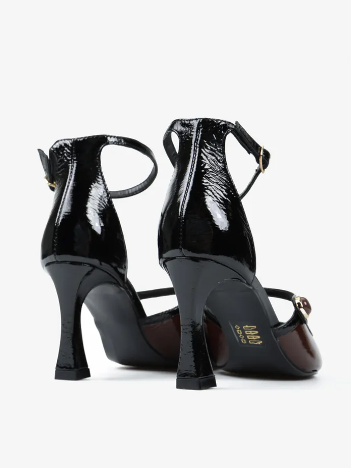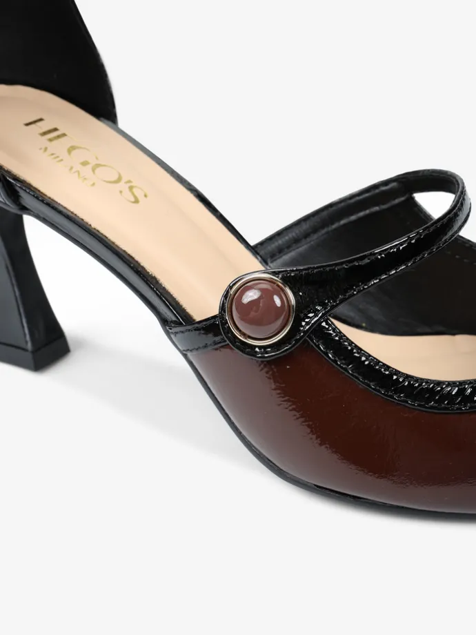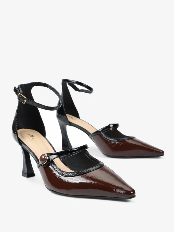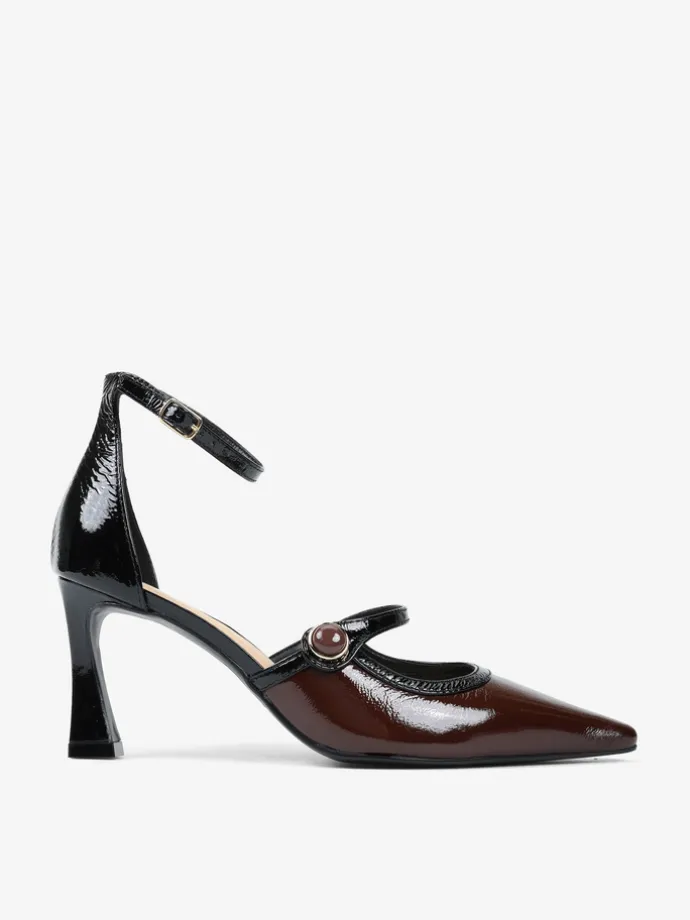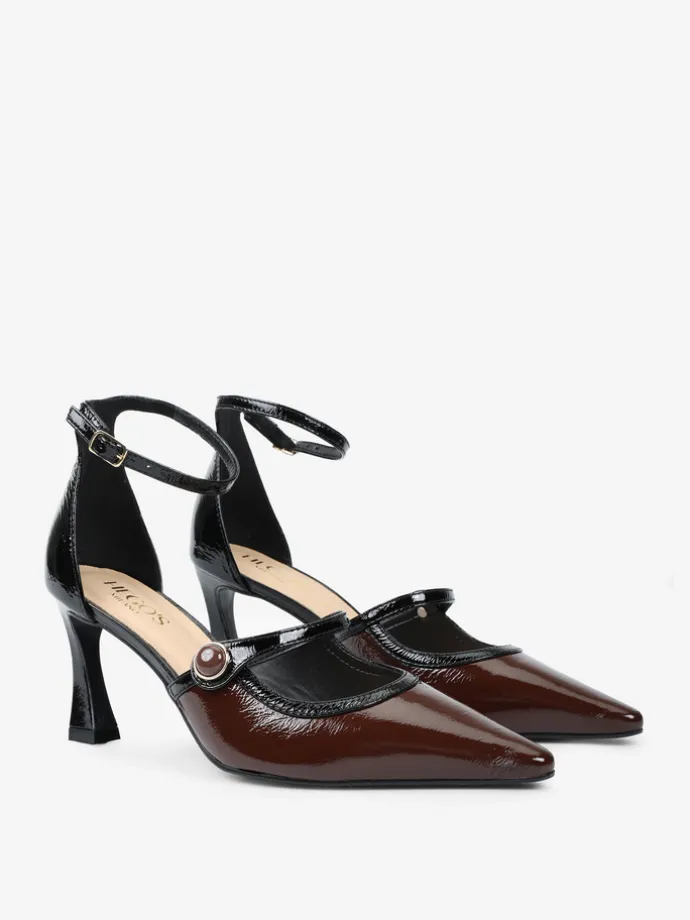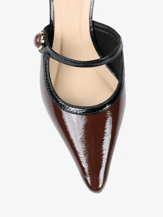 Lakierowane szpilki z zakrytą pięta i regulowanym paskiem na kostce. Brązowy nosek w szpic z ozdobnym paskiem.