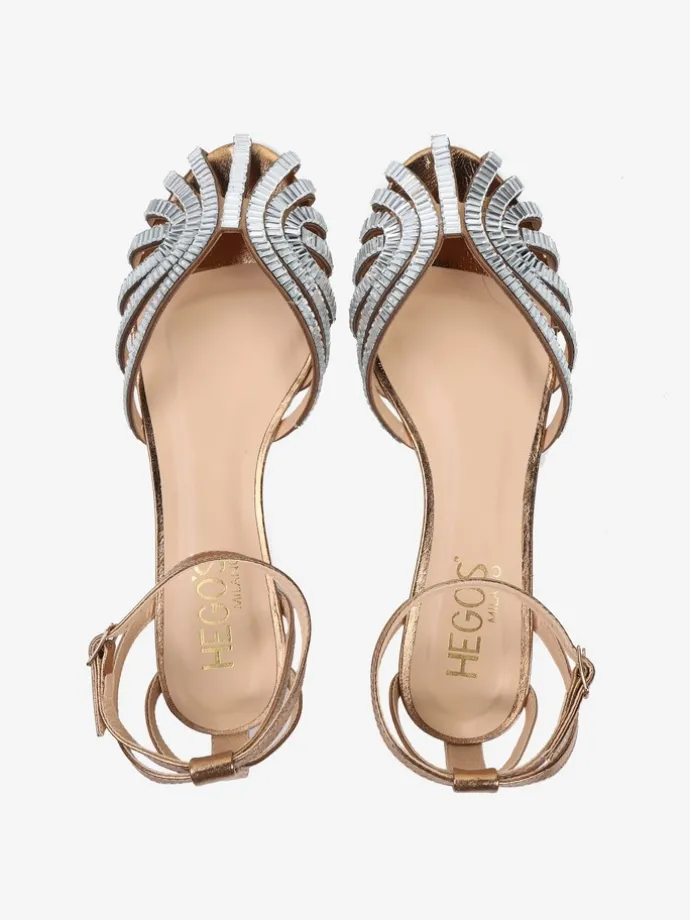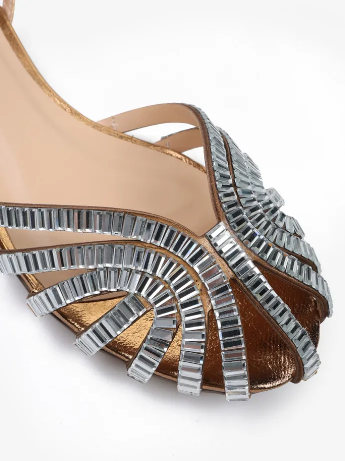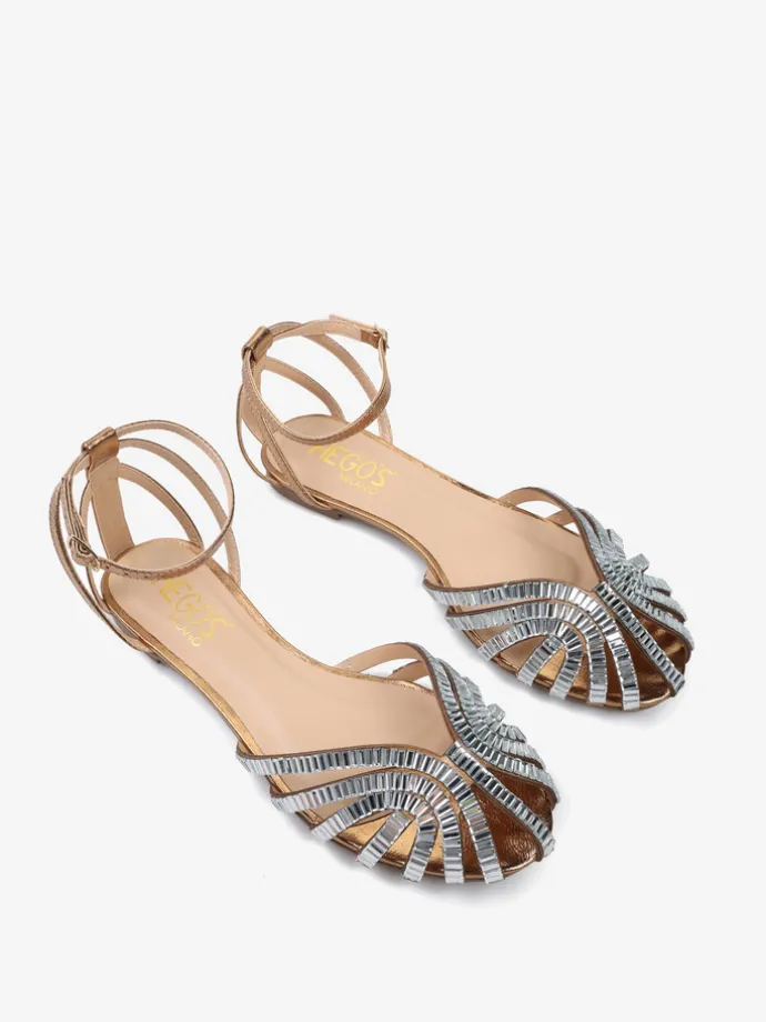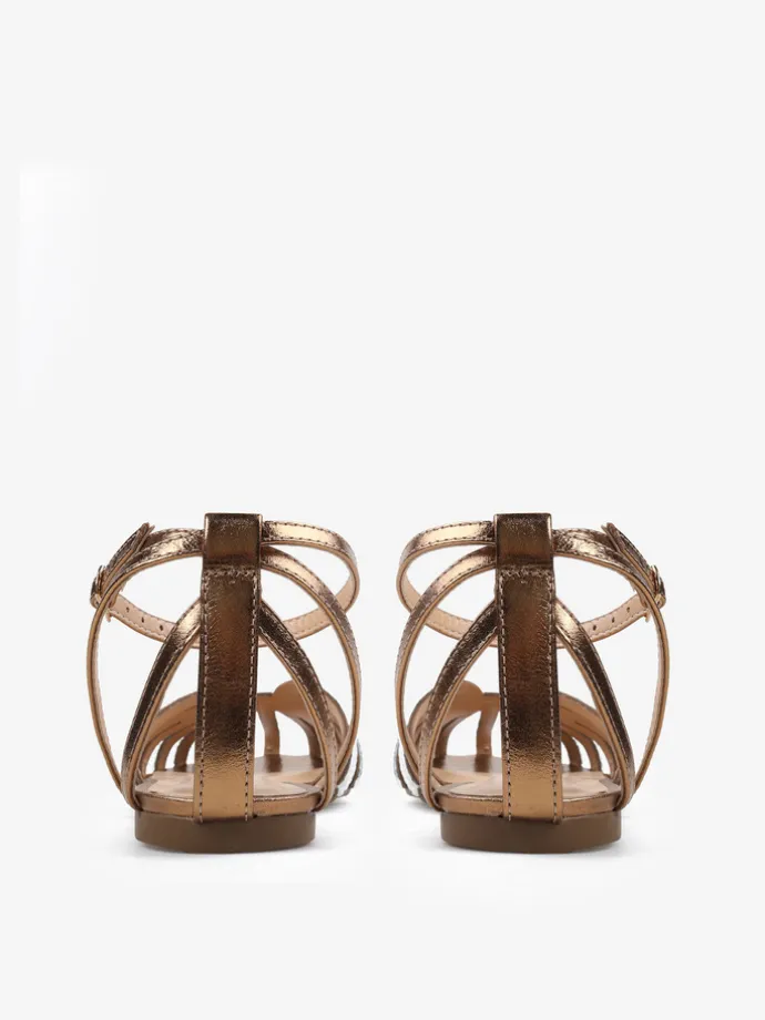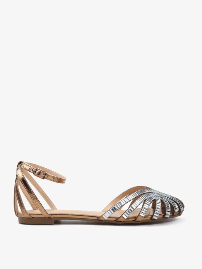 Sandały z paskami z metalizowanej skóry, wykończone ozdobnymi kryształkami na zabudowanym nosku. Płaska podeszwa i regulowane zapięcie przy kostce.