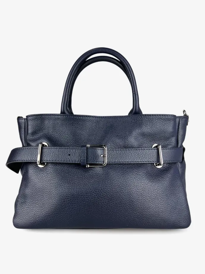 Torebka wykonana z mięsistej skóry naturalnej, z ozdobnym paskiem. Trzy niezależne przegródki i dodatkowy pasek do noszenia na ramieniu.