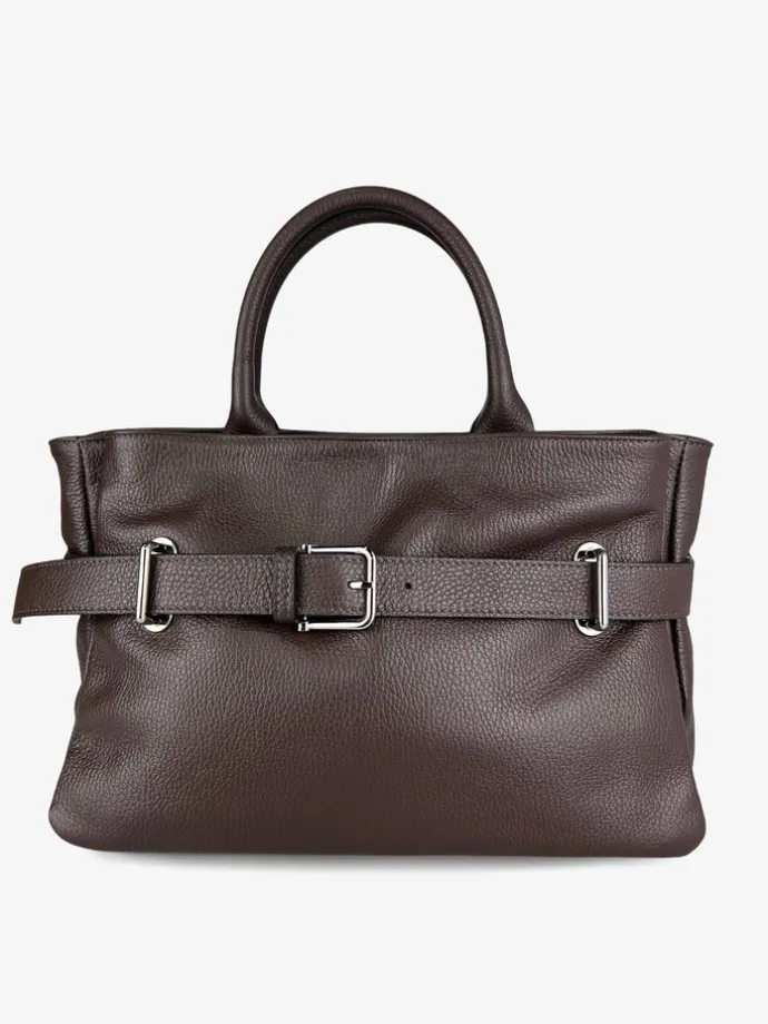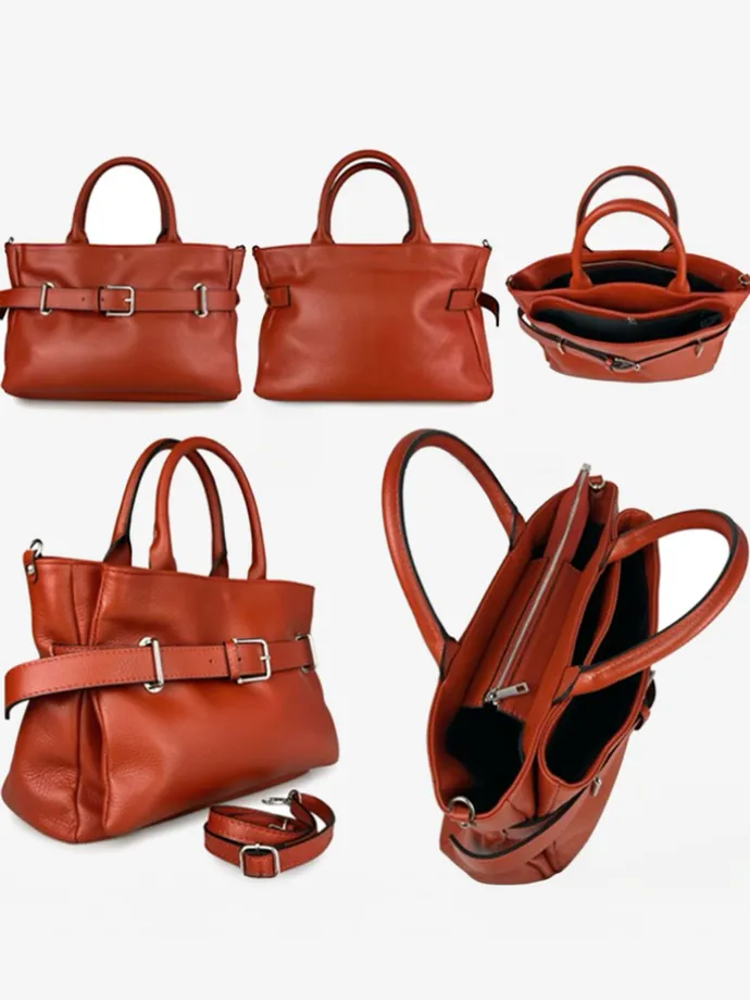 Torebka wykonana z mięsistej skóry naturalnej, z ozdobnym paskiem. Trzy niezależne przegródki i dodatkowy pasek do noszenia na ramieniu.