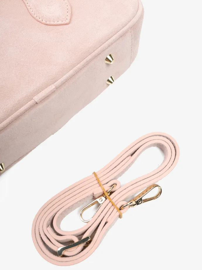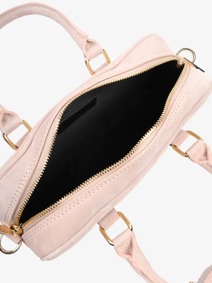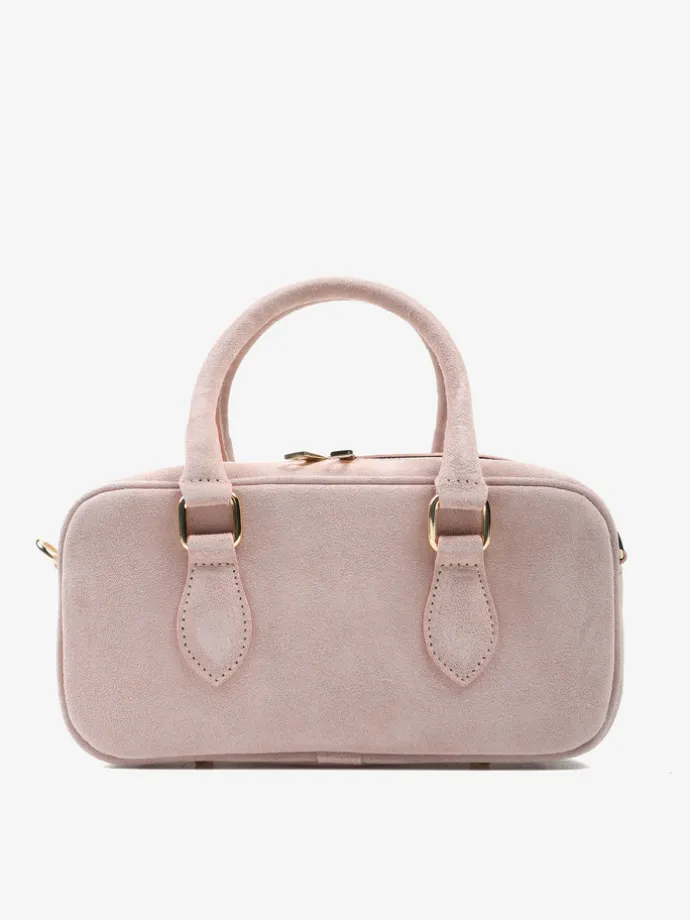 Mała, zamszowa torebka typu kuferek. Zapinanie na zamek. Dodatkowy, odczepiany pasek do noszenia na ramieniu.