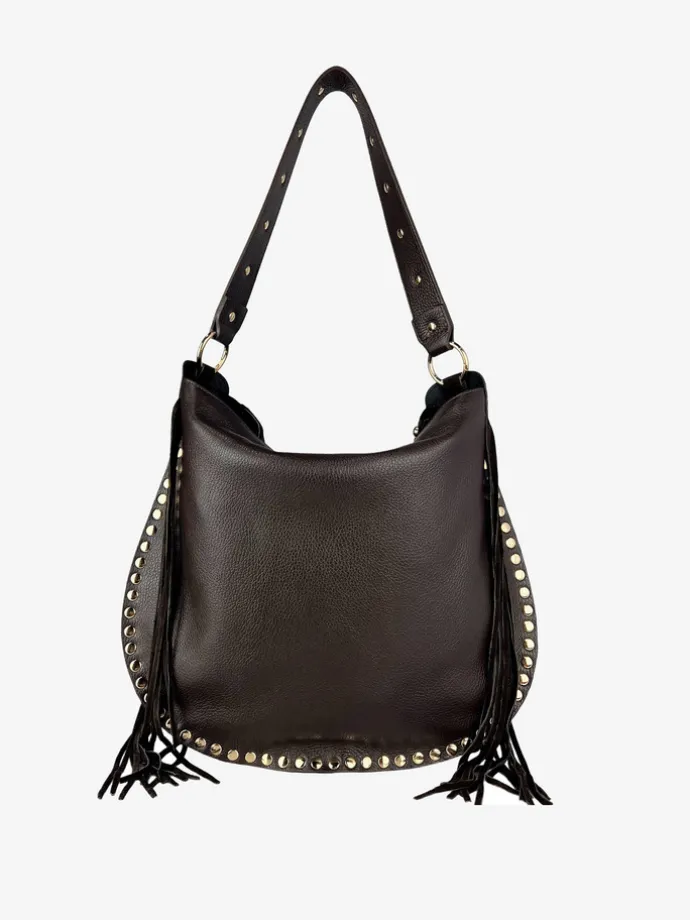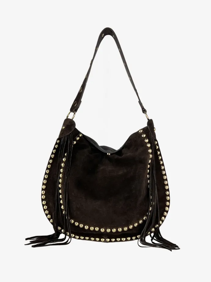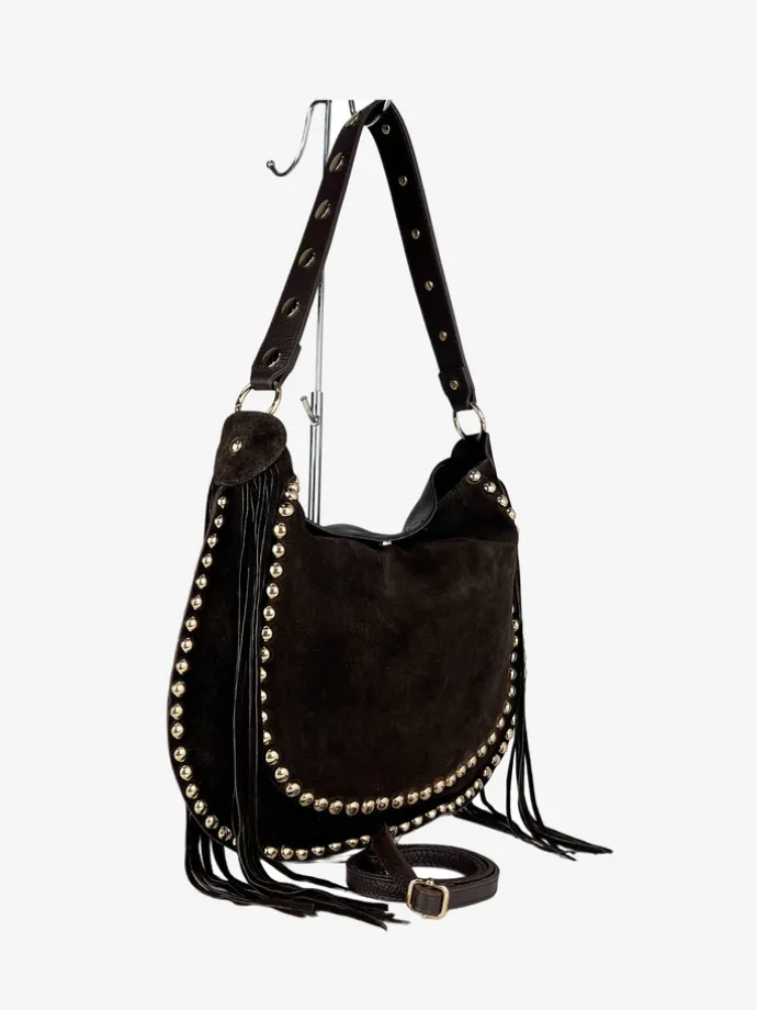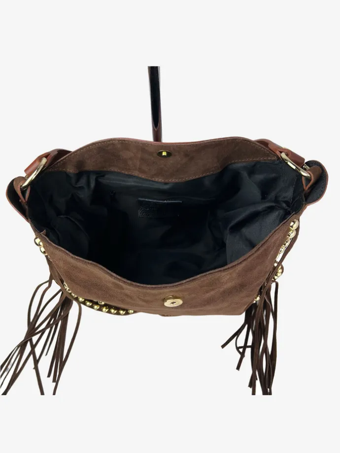 Torebka dwustronna – z naturalnego zamszu i skóry. W komplecie szeroki pasek z ćwiekami i wąski, regulowany. Ozdobne ćwieki i frędzle.