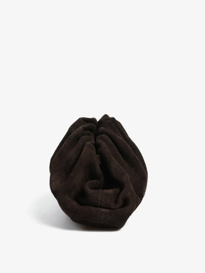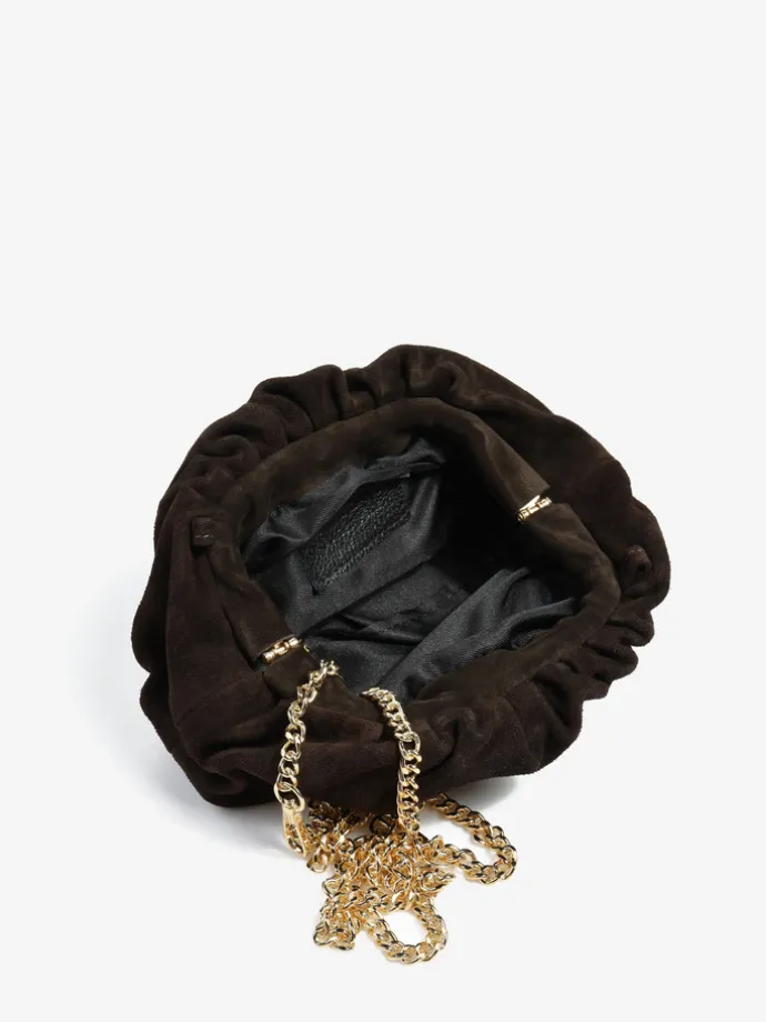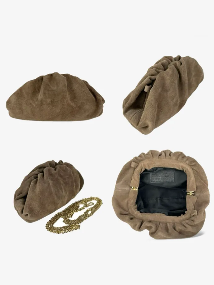 Mała torebka do ręki zamykana na zatrzask, wykonana z zamszu. Dodatkowy, odczepiany łańcuszek do noszenia na ramieniu.