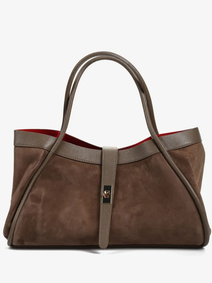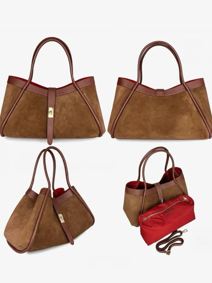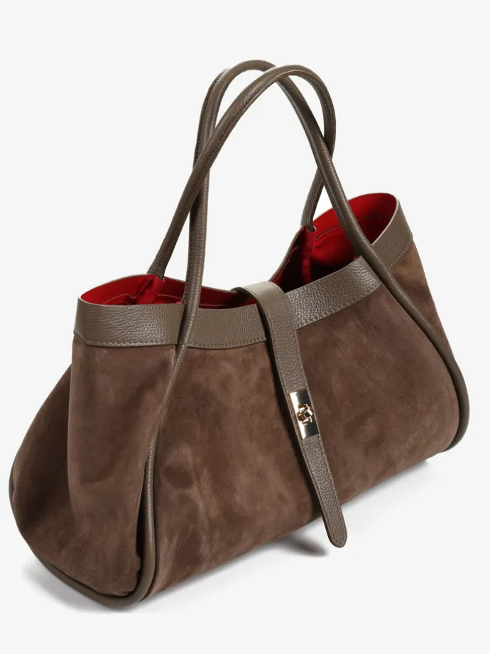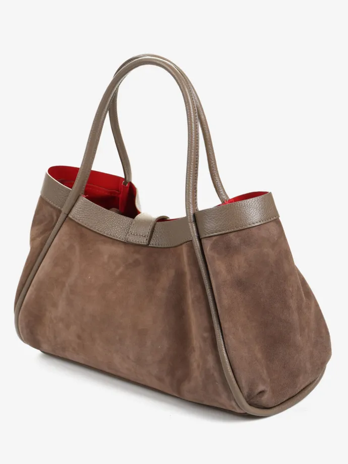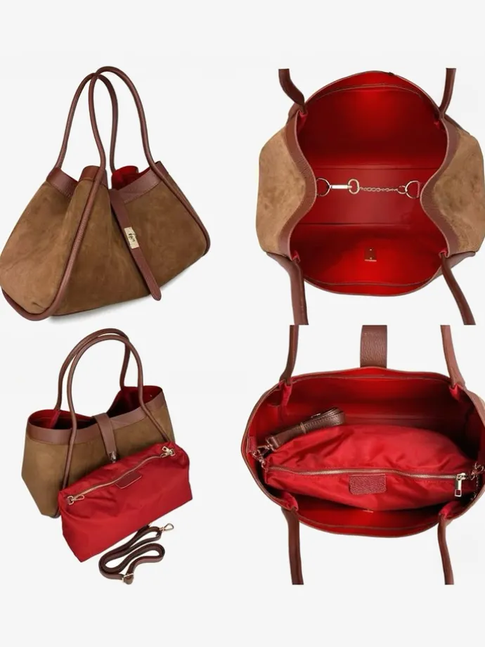 Elegancka torebka wykonana z wysokiej jakości zamszu z elementami skóry licowej. Wewnątrz znajduje się wyjmowana kosmetyczka, a dzięki łańcuszkowi można zmienić kształt torebki. Czerwone wnętrze dodaje jej wyjątkowego charakteru, a pojemność zapewnia komfort użytkowania na co dzień.