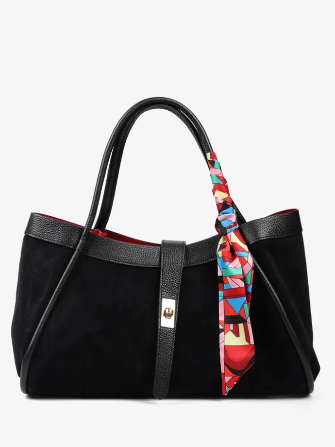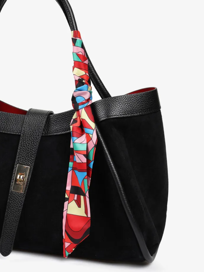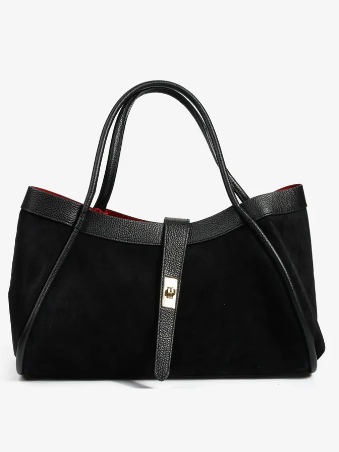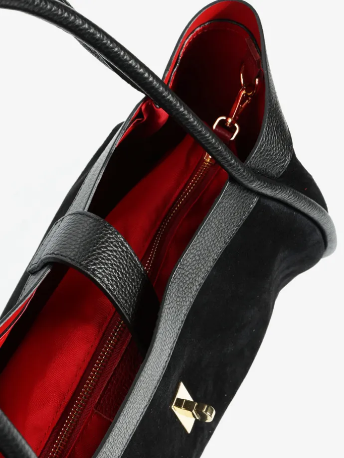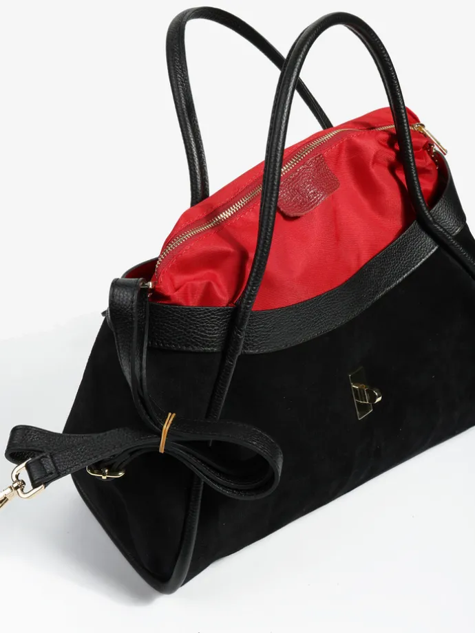 Elegancka torebka wykonana z wysokiej jakości zamszu z elementami skóry licowej. Wewnątrz znajduje się wyjmowana kosmetyczka, a dzięki łańcuszkowi można zmienić kształt torebki. Czerwone wnętrze dodaje jej wyjątkowego charakteru, a pojemność zapewnia komfort użytkowania na co dzień.