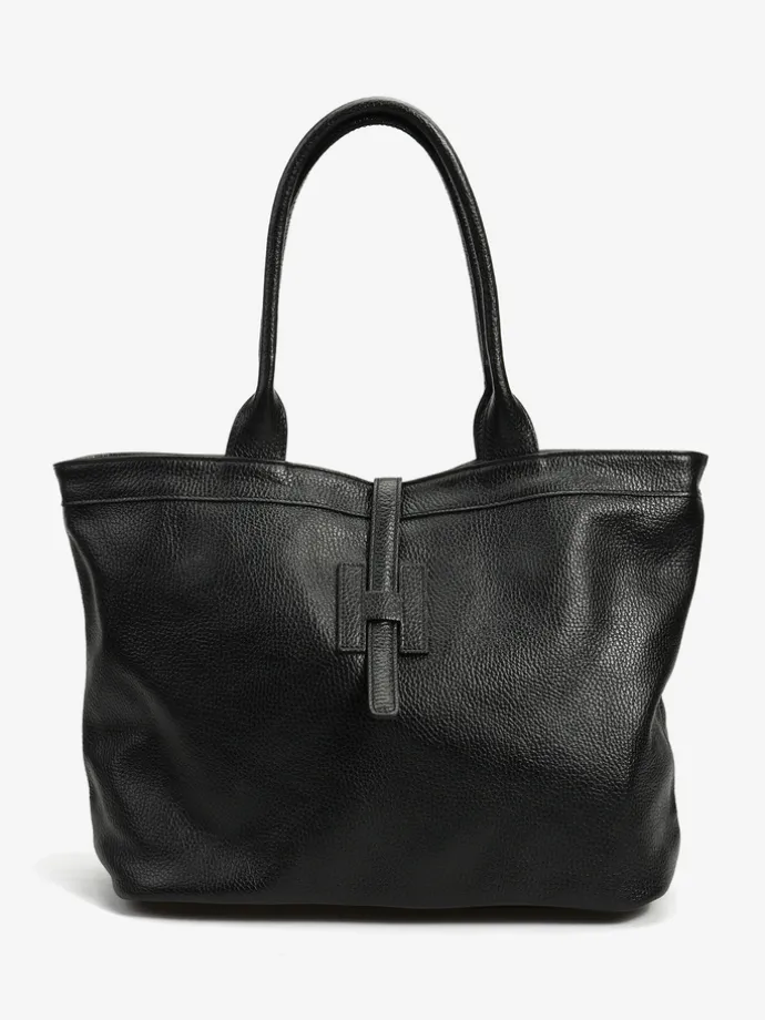 Skórzany shopper z ozdobnym zapięciem w kształcie litery H – jak HEGO’S MILANO. Dzięki wewnętrznemu haczykowi torba może być noszona na dwa sposoby, zmieniając swój kształt. Dodatkowe zapięcie na suwak i wewnętrzna kieszonka.