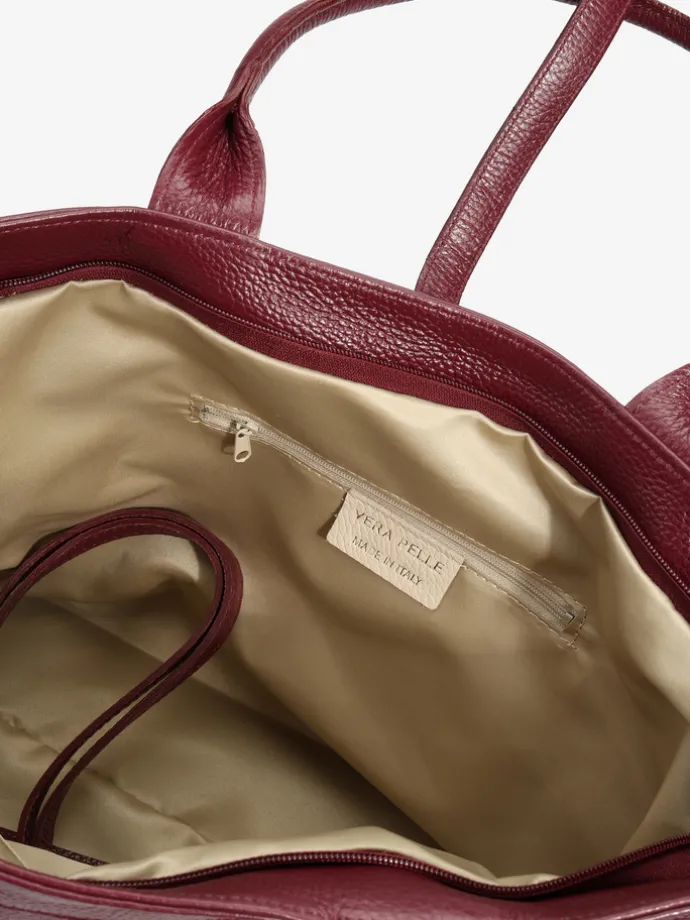 Skórzany shopper z ozdobnym zapięciem w kształcie litery H – jak HEGO’S MILANO. Dzięki wewnętrznemu haczykowi torba może być noszona na dwa sposoby, zmieniając swój kształt. Dodatkowe zapięcie na suwak i wewnętrzna kieszonka.