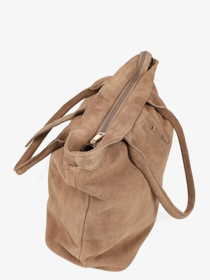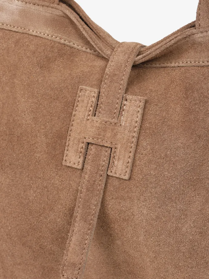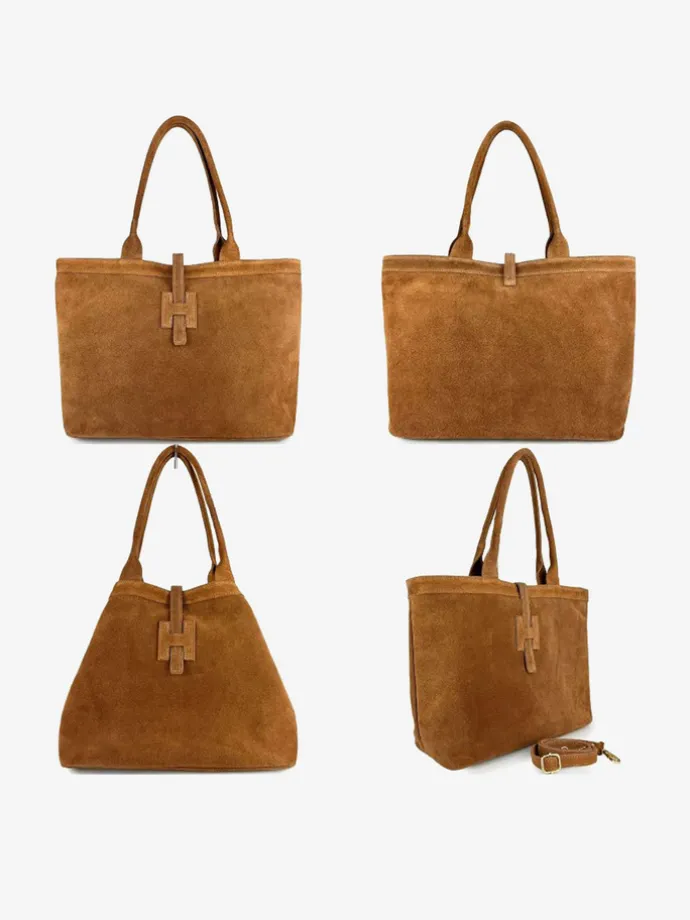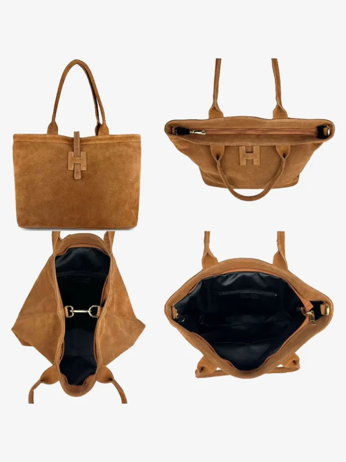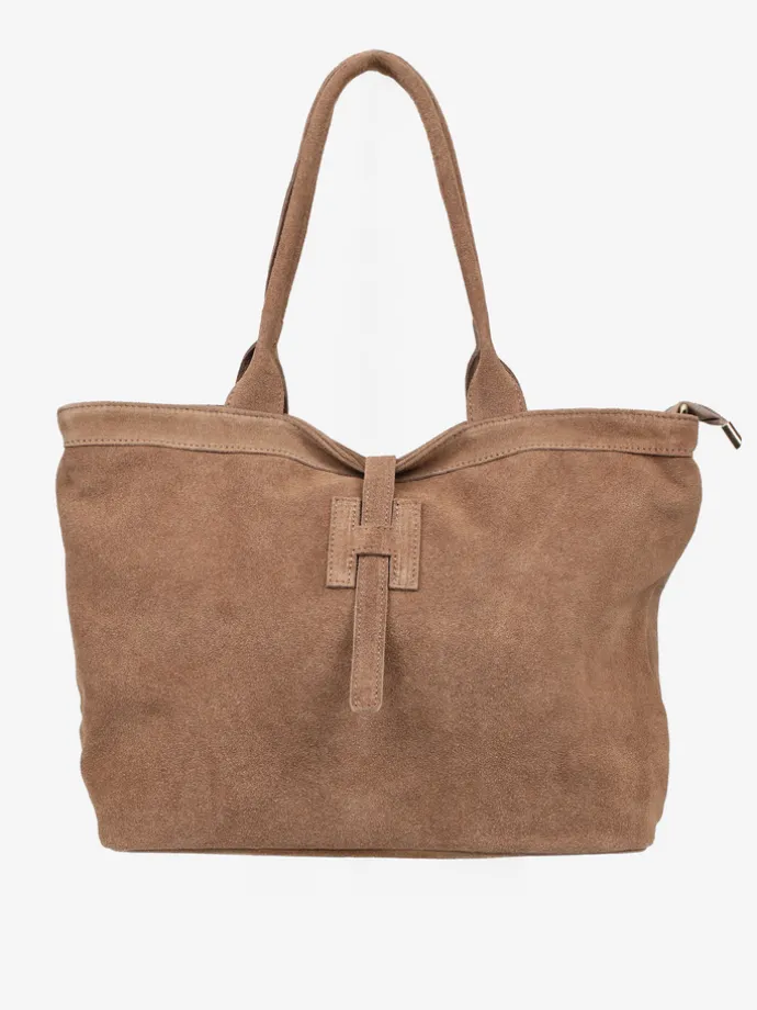 Zamszowy shopper z ozdobnym zapięciem w kształcie litery H – jak HEGO’S MILANO. Dzięki wewnętrznemu haczykowi torba może być noszona na dwa sposoby, zmieniając swój kształt. Dodatkowe zapięcie na suwak i wewnętrzna kieszonka.