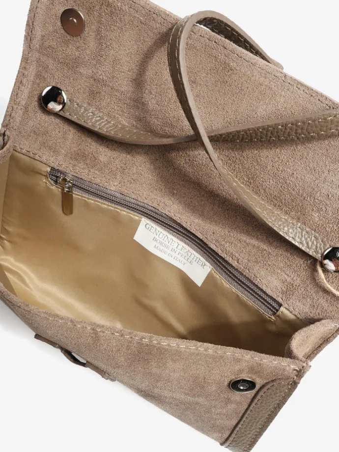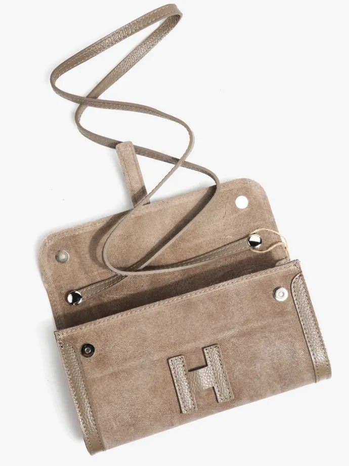 Kopertówka z ozdobnym zapięciem w kształcie litery H – jak HEGO’S MILANO. Dodatkowy pasek do noszenia na ramieniu.