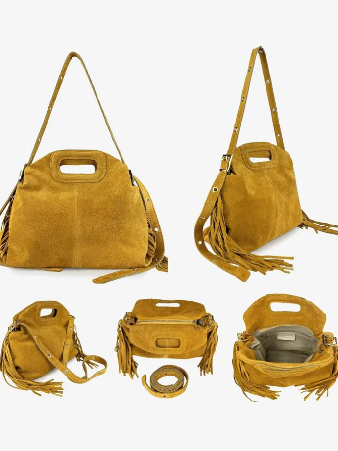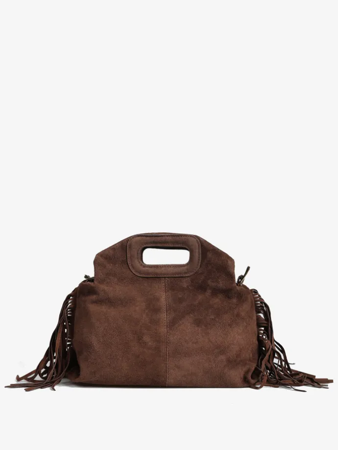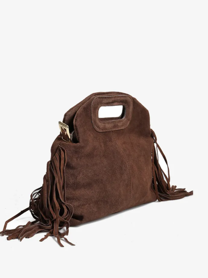 Zamszowa torebka do ręki z zapięciem na suwak i ozdobnymi frędzlami. Dodatkowy pasek do noszenia na ramię.