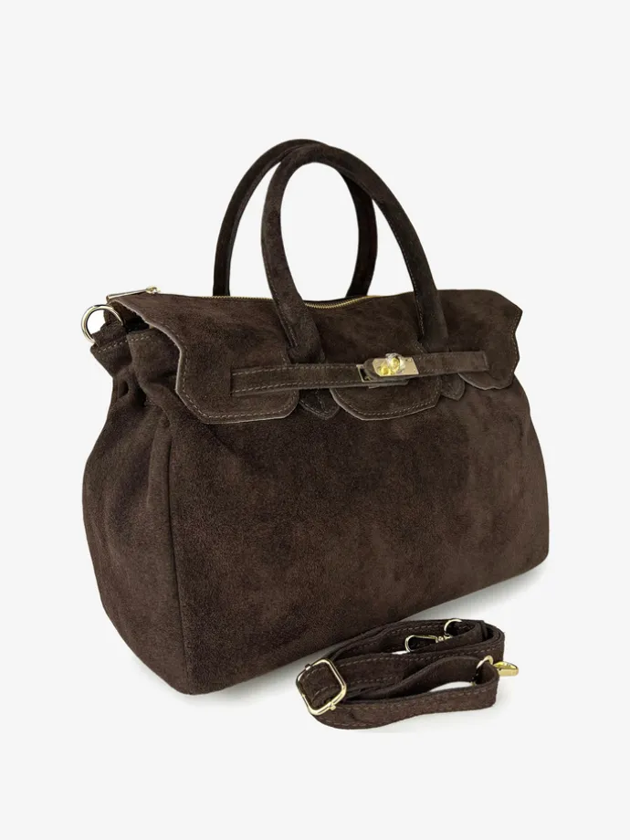 Brązowa torba z ozdobną klapą i złotym zapięciem. Dodatkowy, regulowany pasek do noszenia na ramieniu.