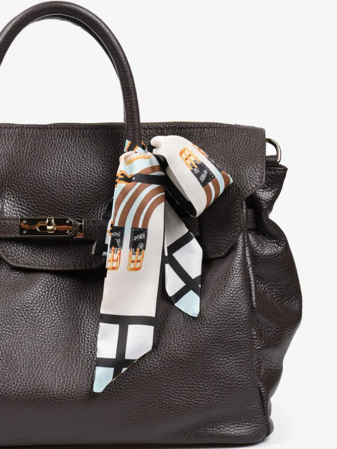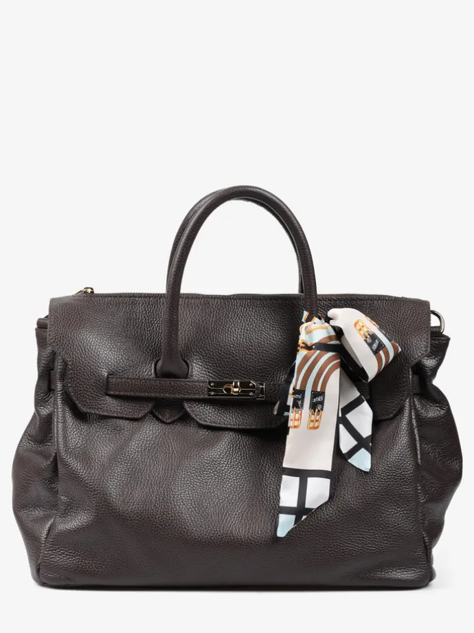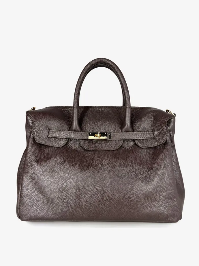 Brązowa torba z ozdobną klapą i złotym zapięciem. Dodatkowy, regulowany pasek do noszenia na ramieniu.