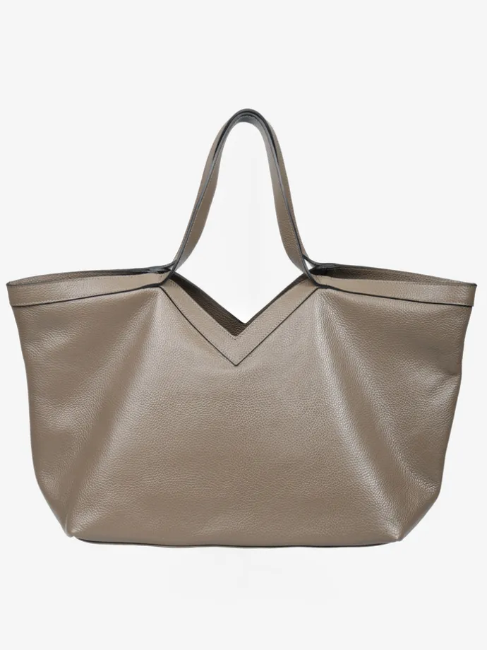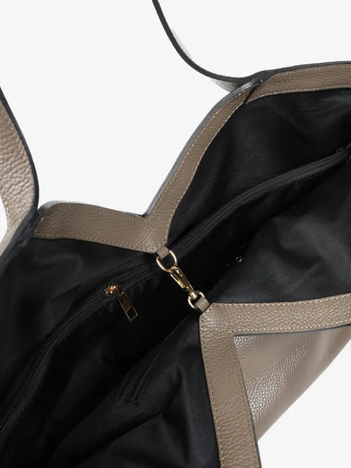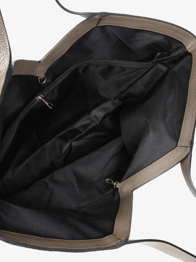 Elegancki shopper z wycięciem w kształcie litery V i zapięciem na haczyk. W środku materiałowa wyściółka i przegródka zapinana na suwak.