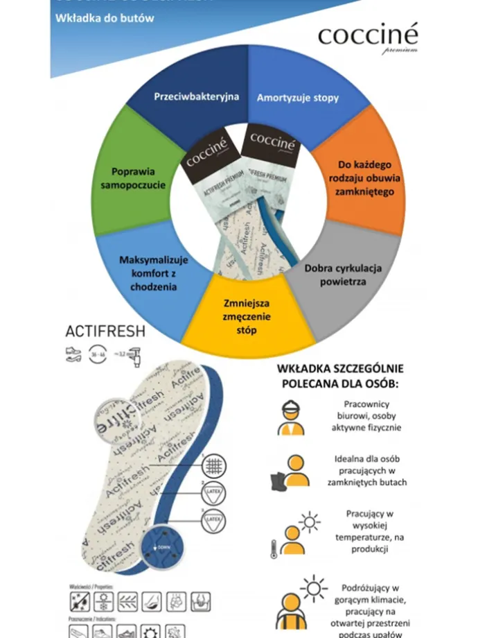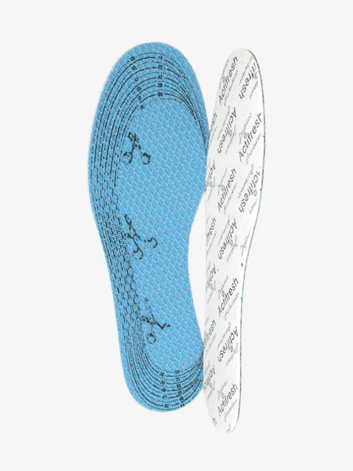 Wkładka antybakteryjna o świeżym zapachu składająca się z trzech warstw: bawełnianej tkaniny wierzchniej, pianki lateksowej ze środkiem przeciwbakteryjnym zapobiegającym rozwojowi drobnoustrojów w wilgotnym i ciepłym środowisku buta oraz przeciwpoślizgowej pianki lateksowej, z fakturą rombów. Perforacja zapewnia cyrkulację powietrza, która daje poczucie komfortu.