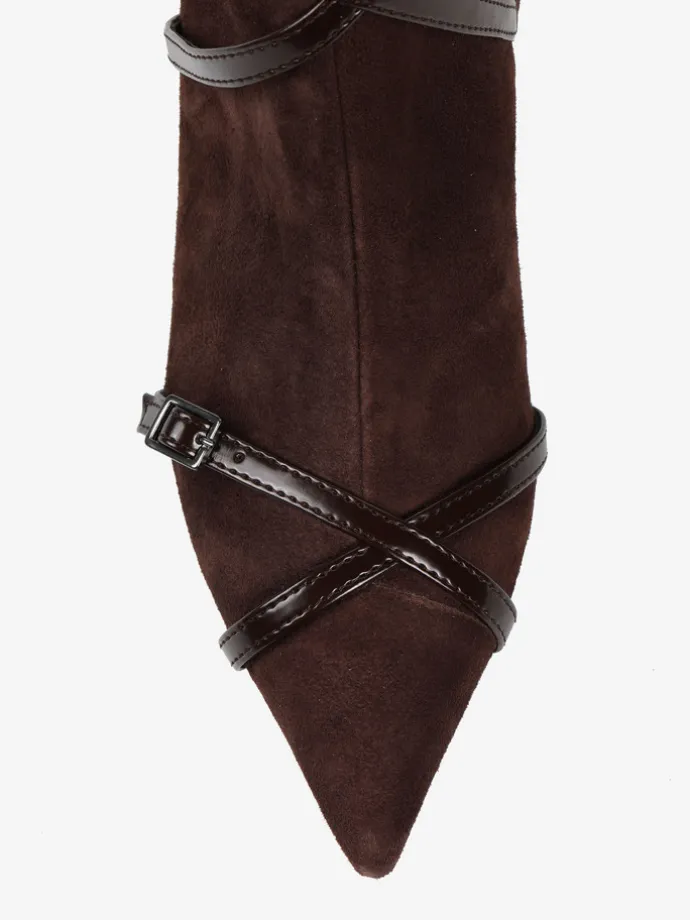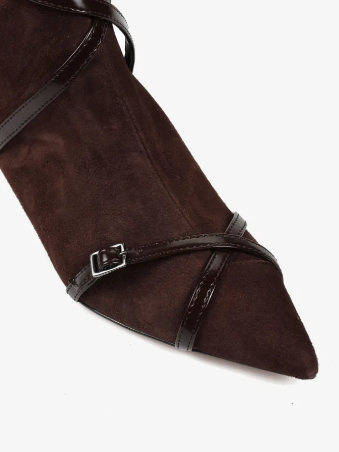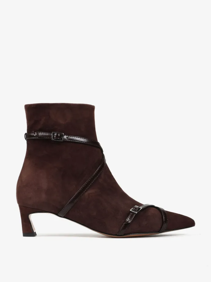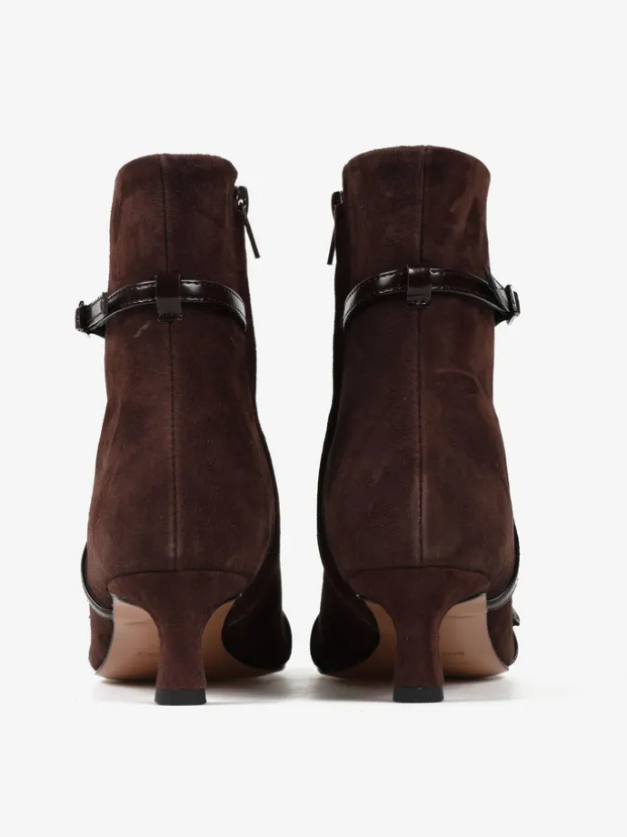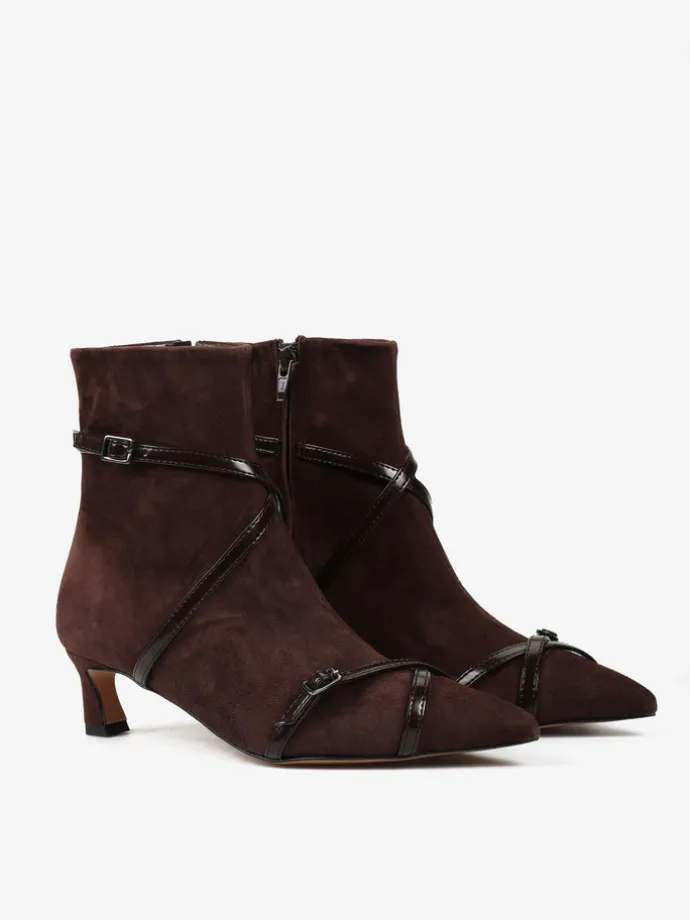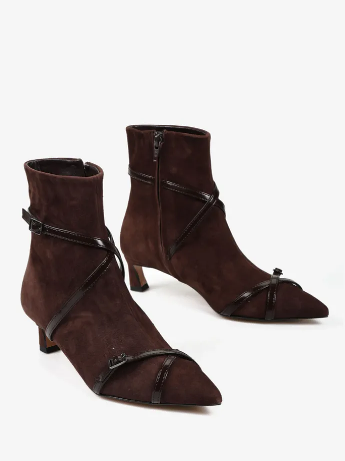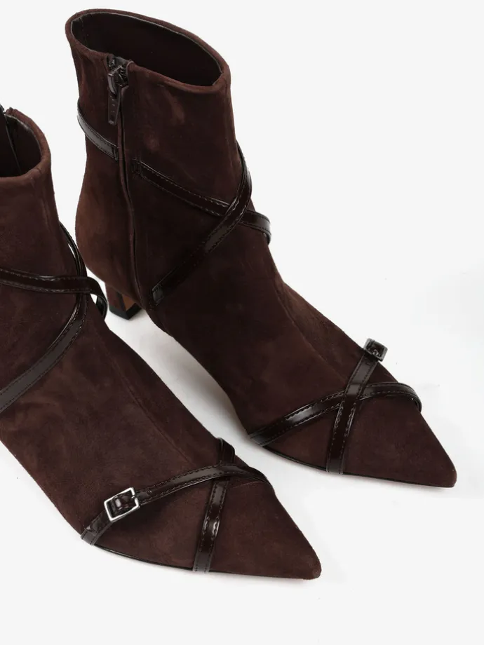 Zamszowe botki z ozdobnymi paseczkami, na niskiej szpilce. Noski w szpic i zapięcie na suwak.