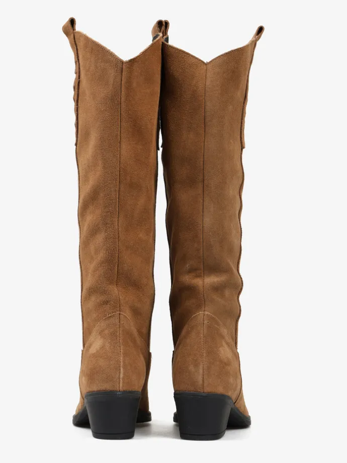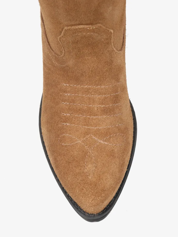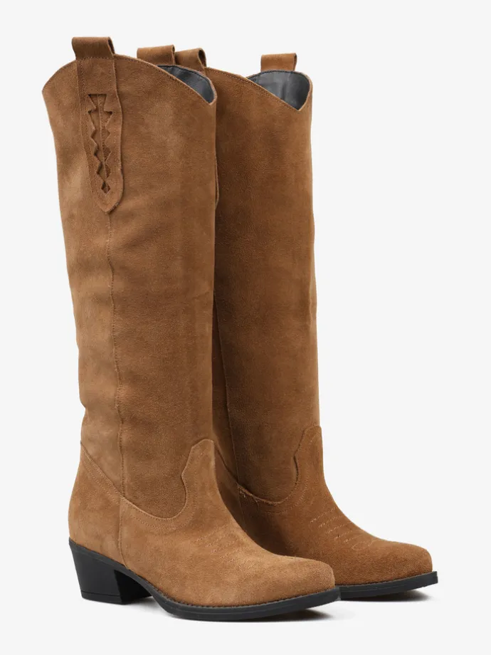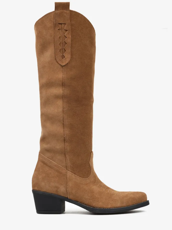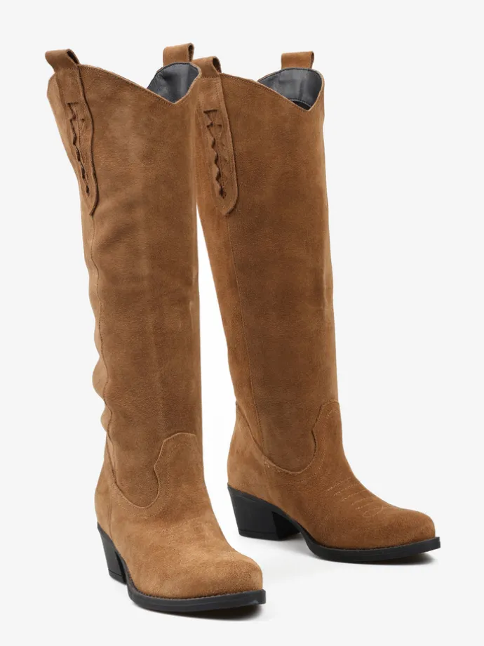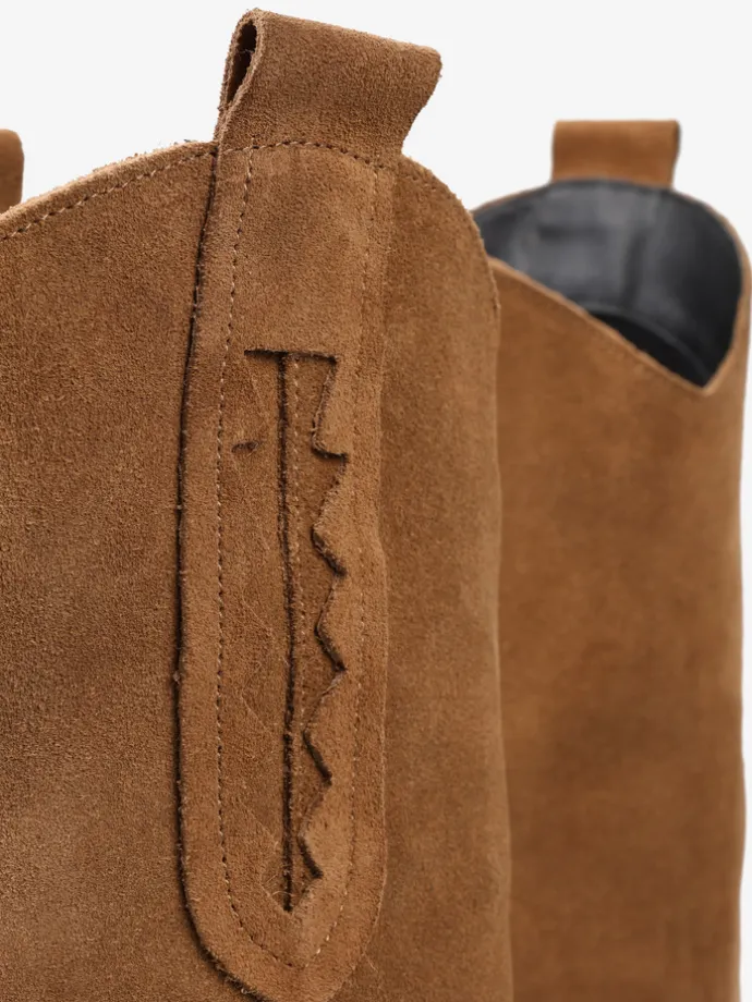 Klasyczne, zamszowe kowbojki z ozdobną szlufką na cholewie i haftem na noskach.