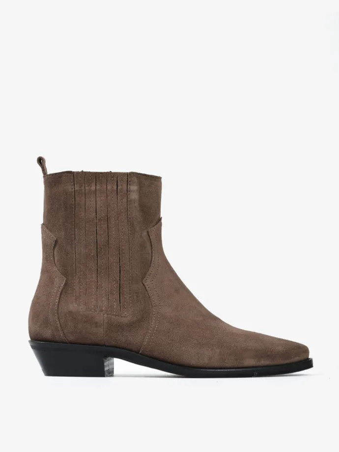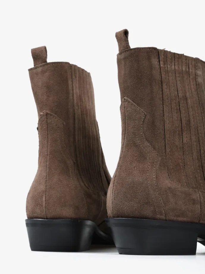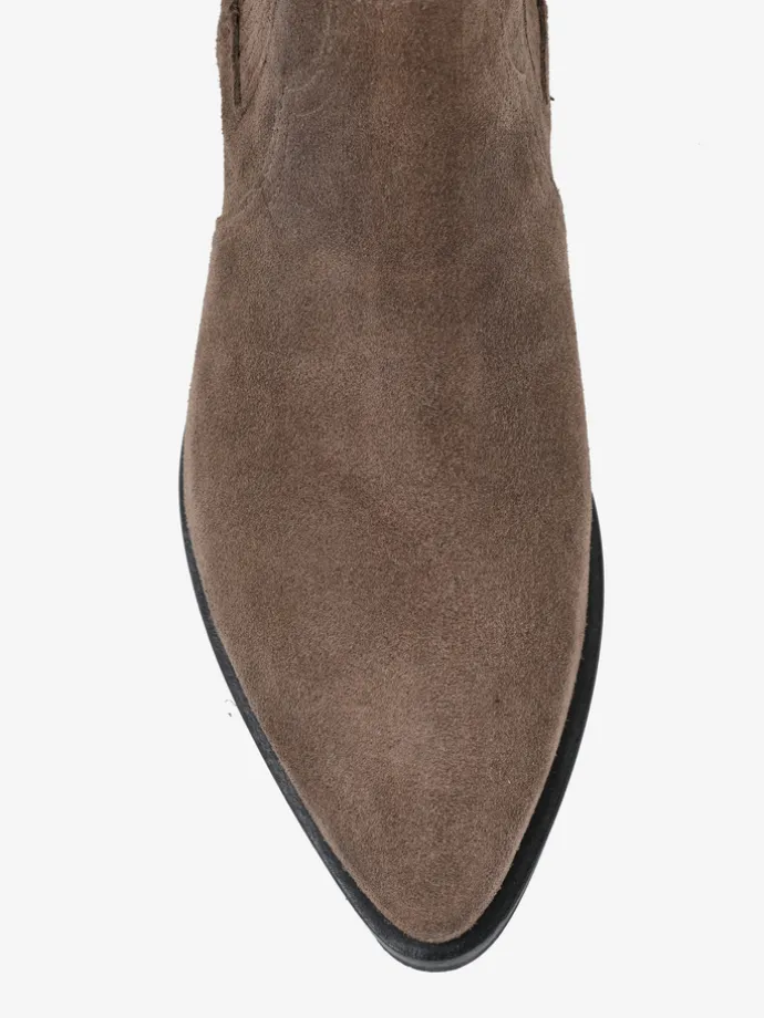 Klasyczne kowbojki wykonane z zamszu w kolorze taupe.