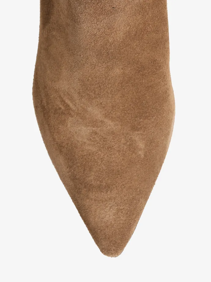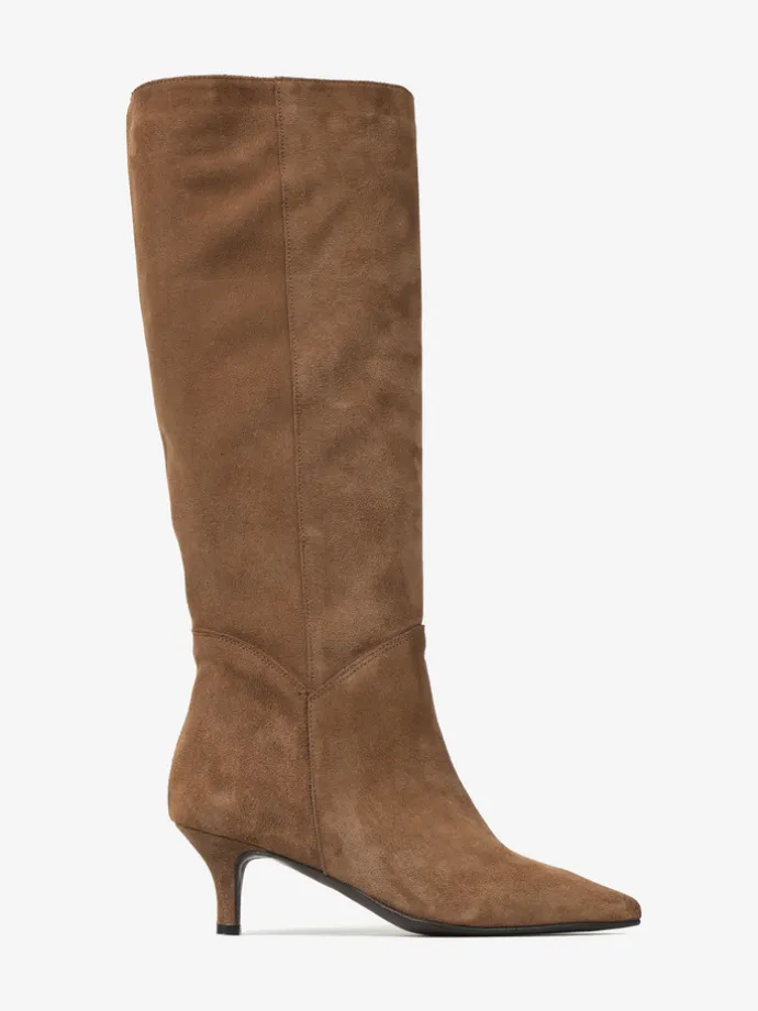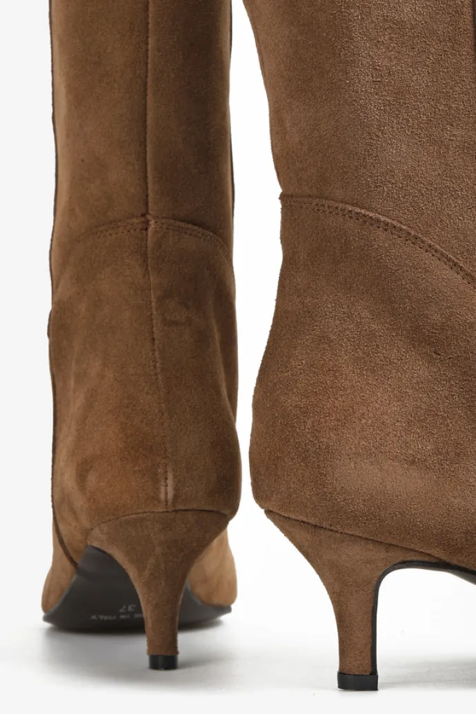 Zamszowe kozaki na niskiej szpilce. Noski w szpic i cholewka z ozdobnymi przeszyciami.