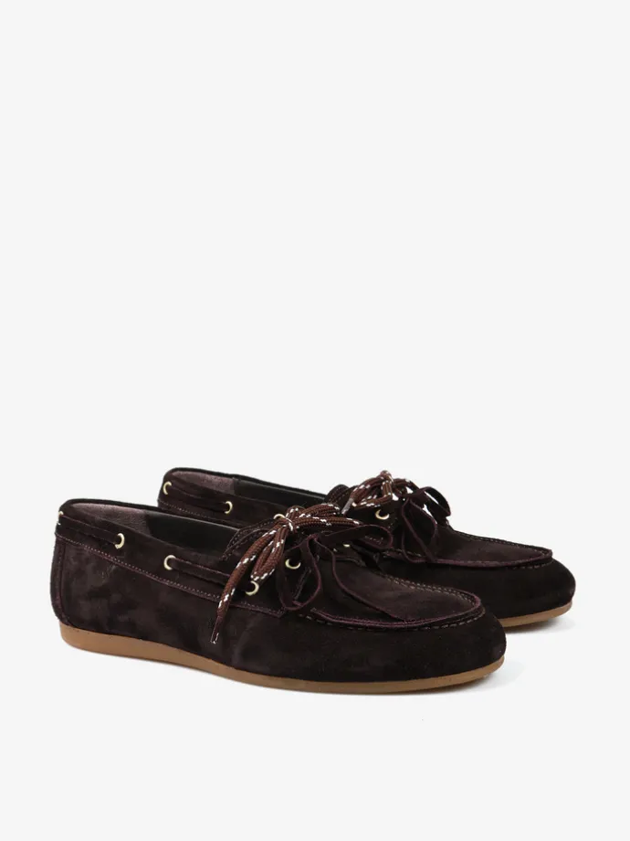 Mokasyny wykonane z brązowego zamszu z wiązaniem pozwalającym na idealne dopasowanie. Dodatkowa para brązowych sznurowadeł.