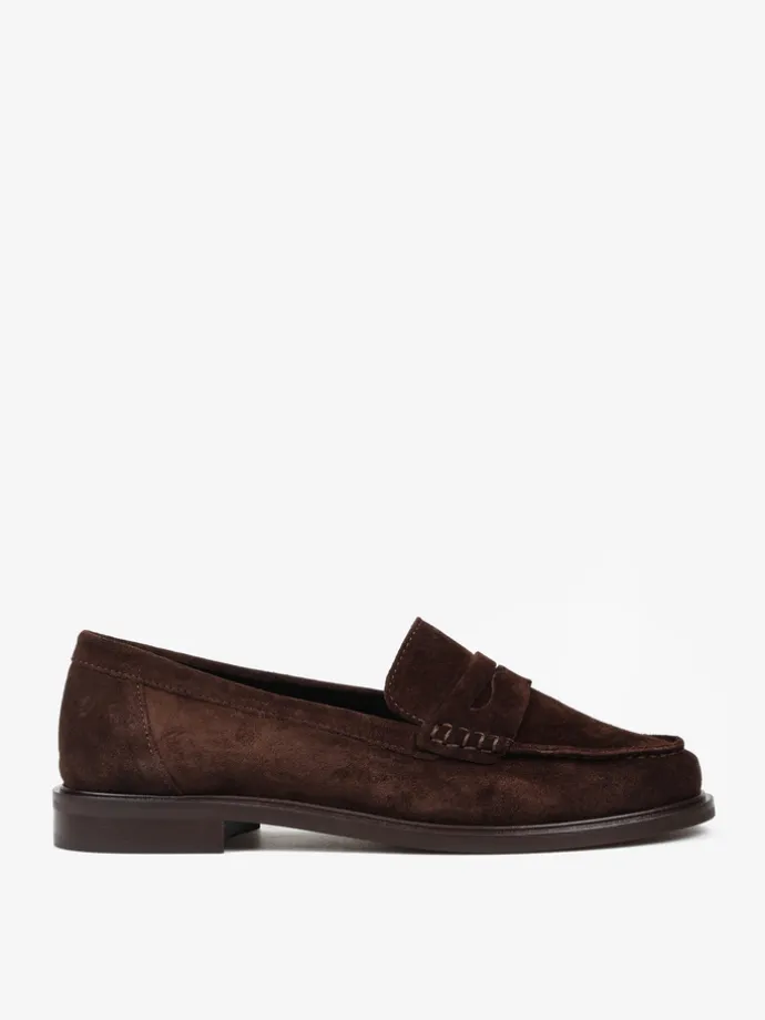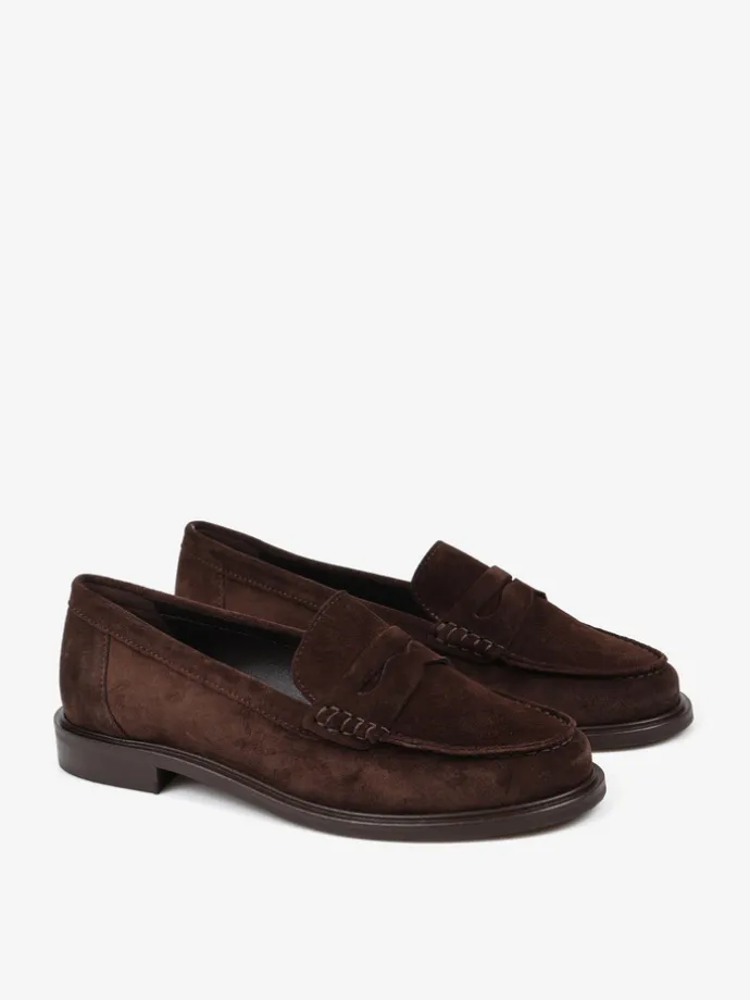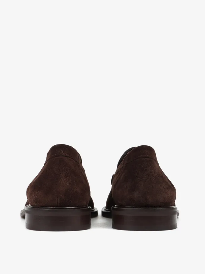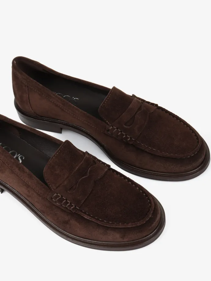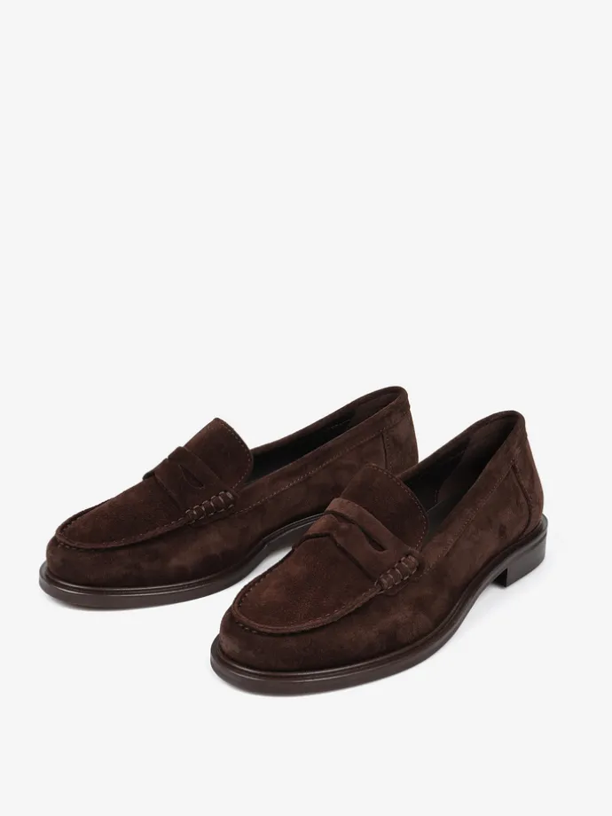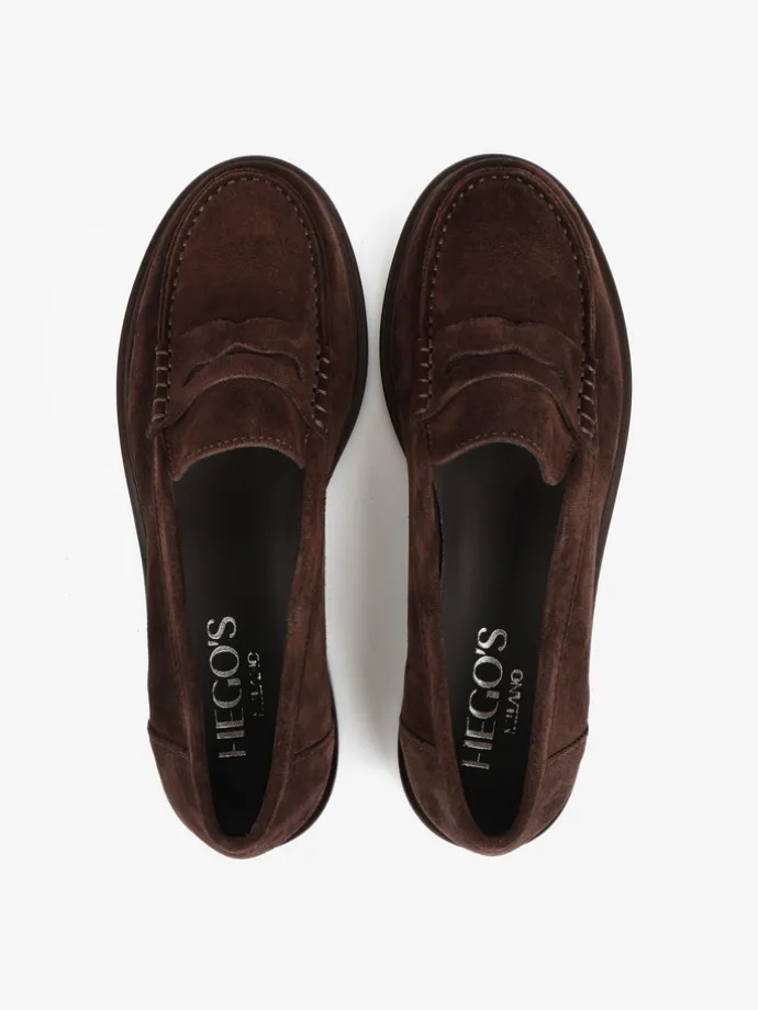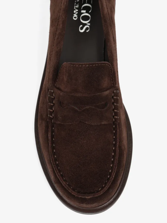 Zamszowe, klasyczne mokasyny college z ozdobną patką i wysokim językiem.