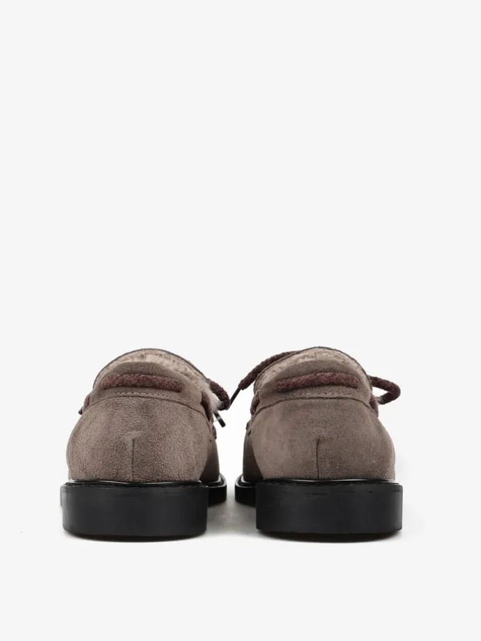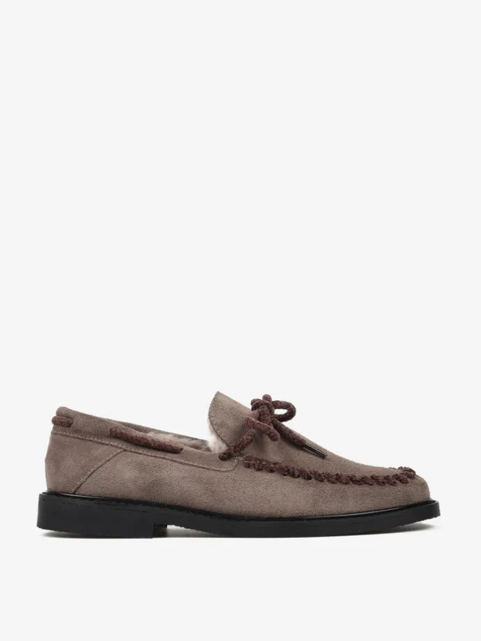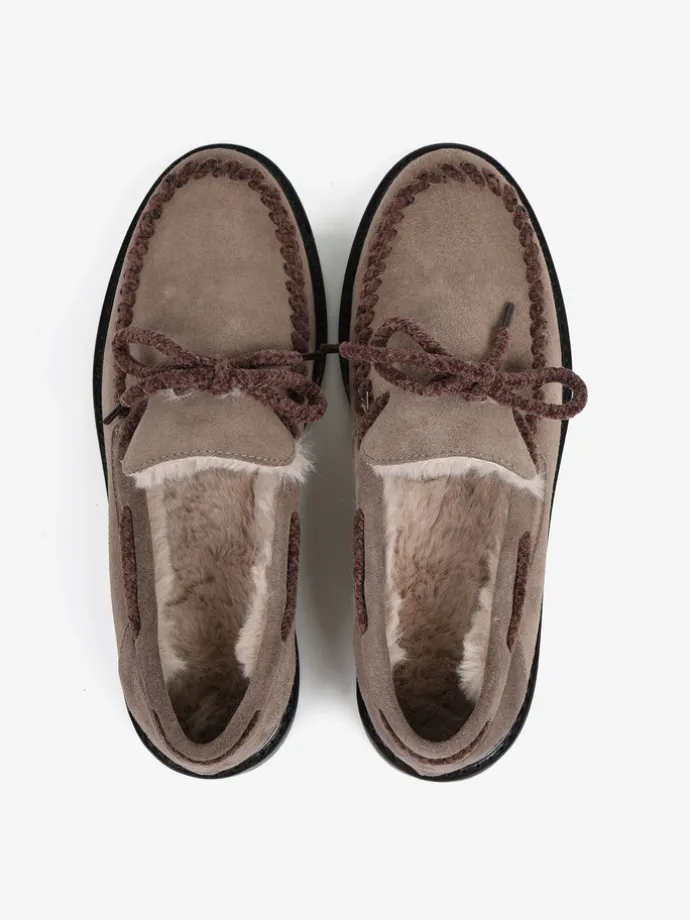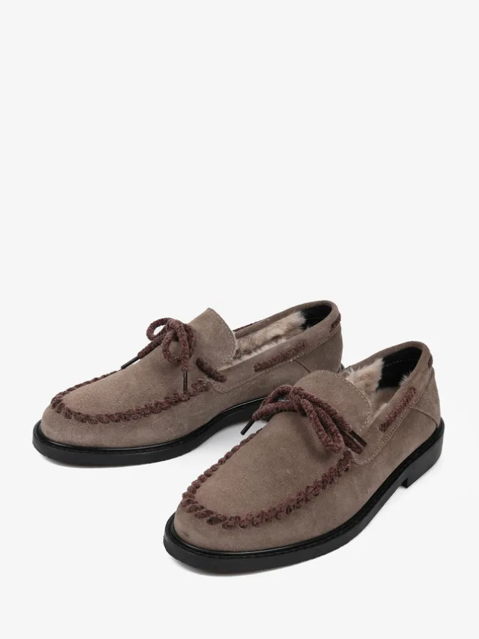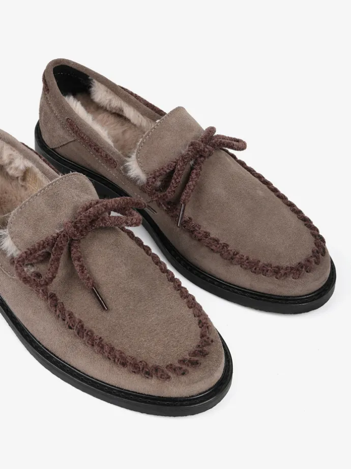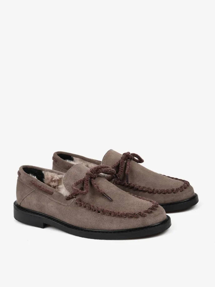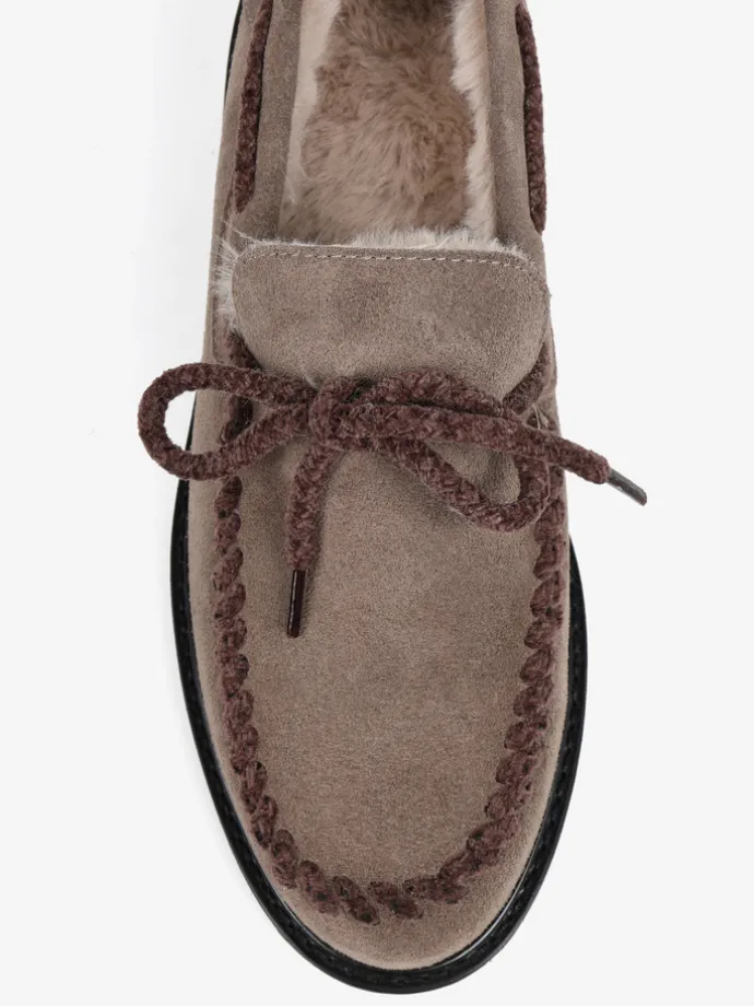 Zamszowe mokasyny z wnętrzem wyłożonym miękkim, sztucznym futrem. Wiązanie ze sznurka pozwala na idealne dopasowanie.