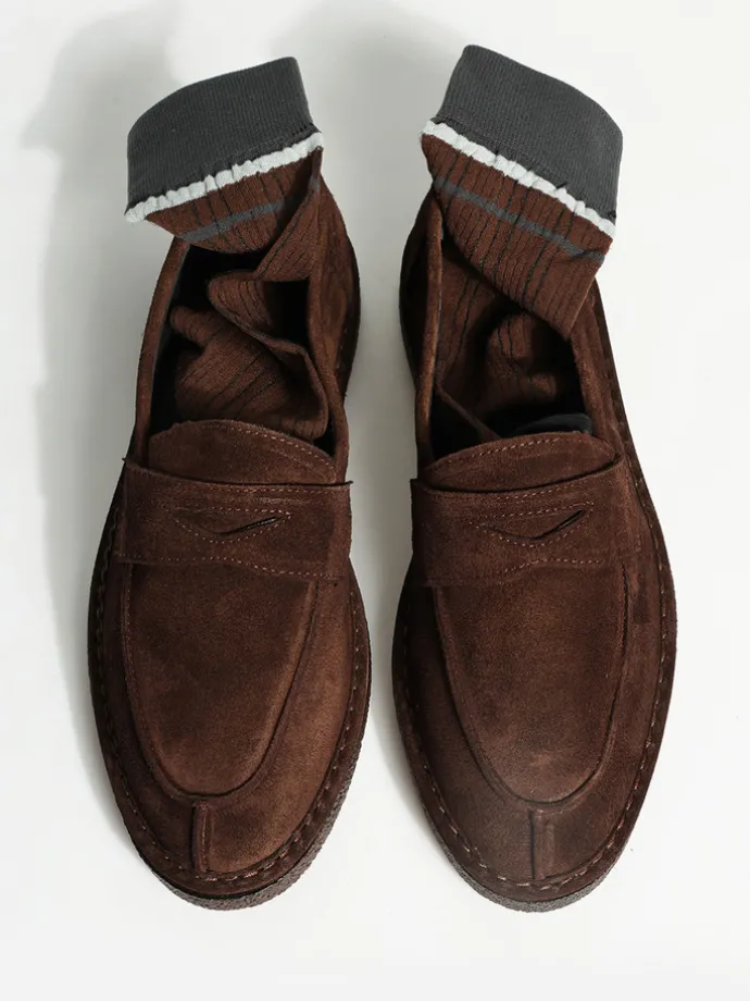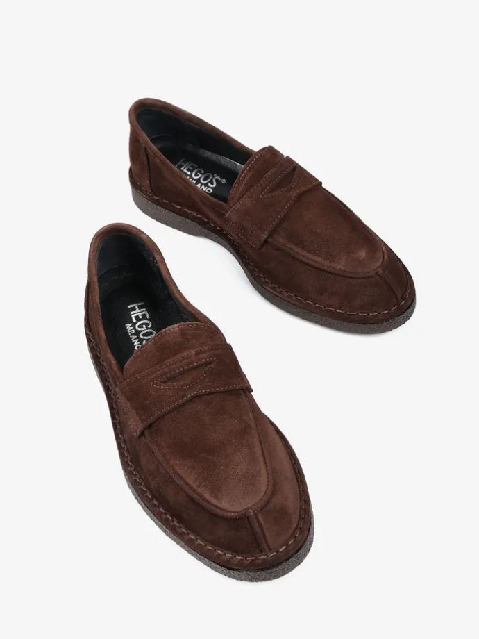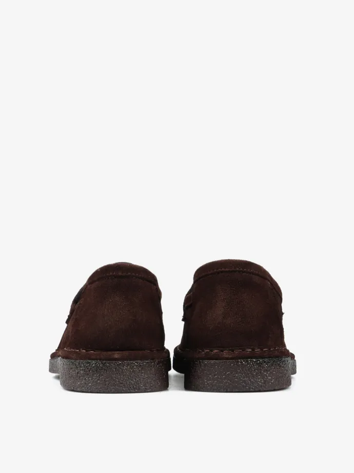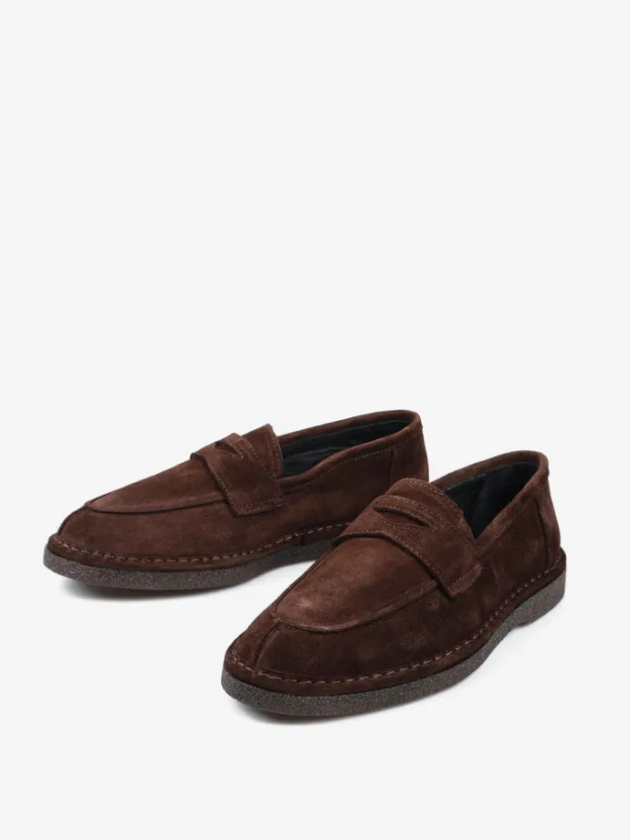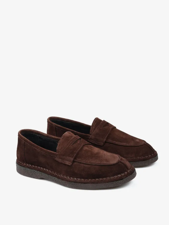 Brązowe, zamszowe mokasyny z patką na gumowej podeszwie.