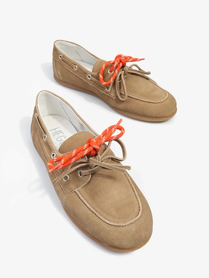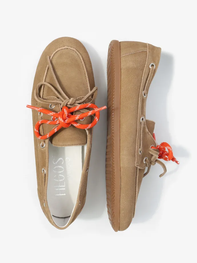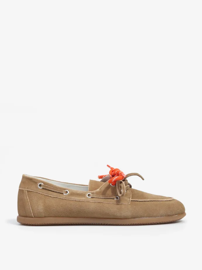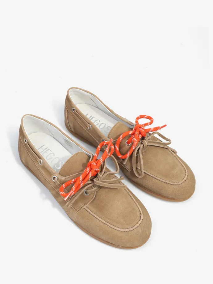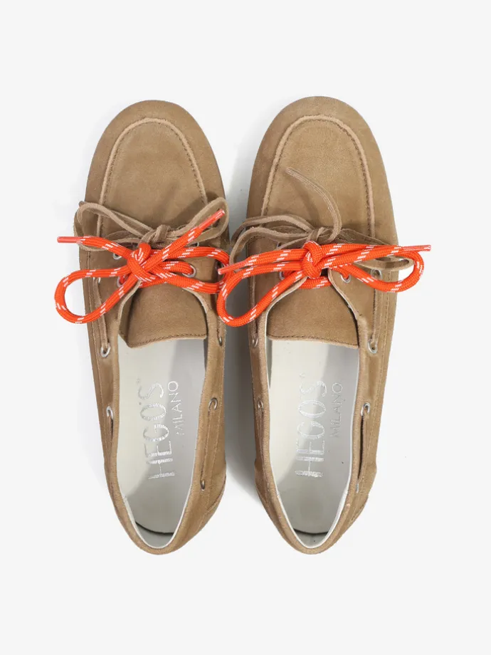 Mokasyny wykonane z rudego zamszu z wiązaniem pozwalającym na idealne dopasowanie. Dodatkowe sznurowadła w kontrastującym, zielonym kolorze.