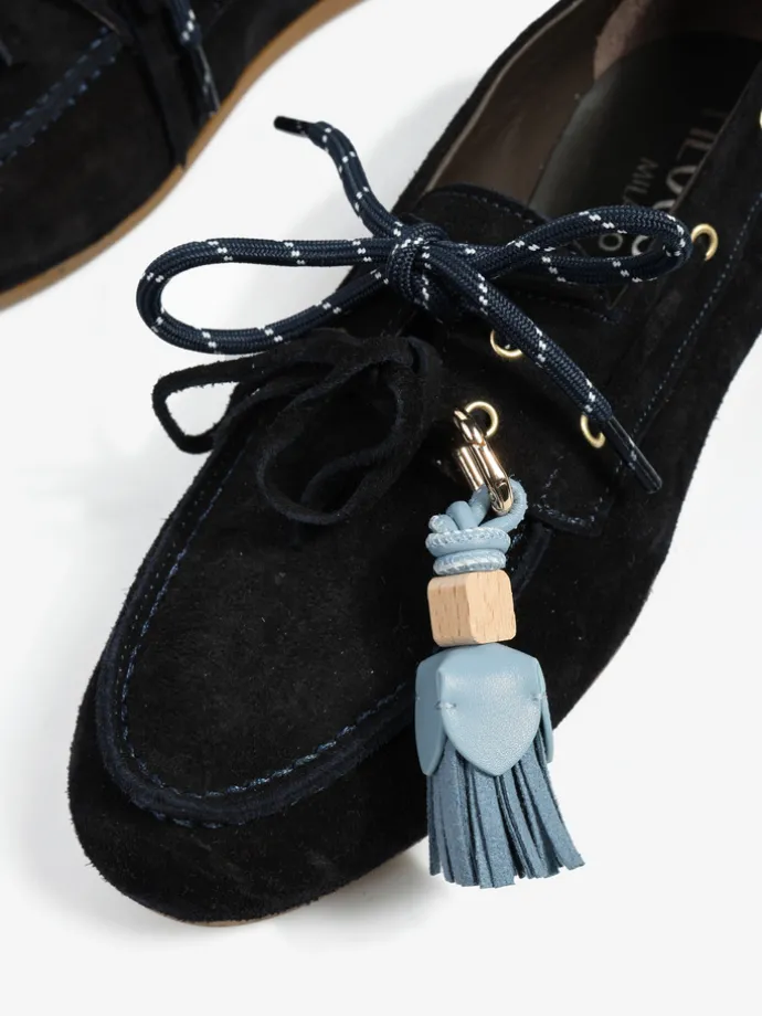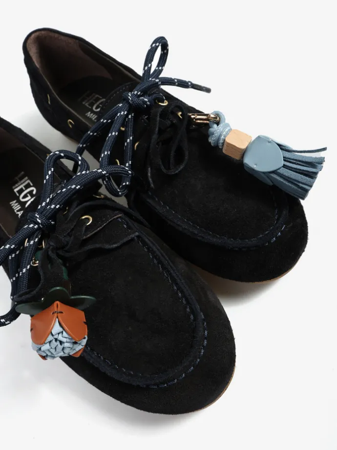 Zamszowe mokasyny z wiązaniem pozwalającym na idealne dopasowanie. W komplecie dodatkowe sznurówki. Przywieszka dostępna oddzielnie.
