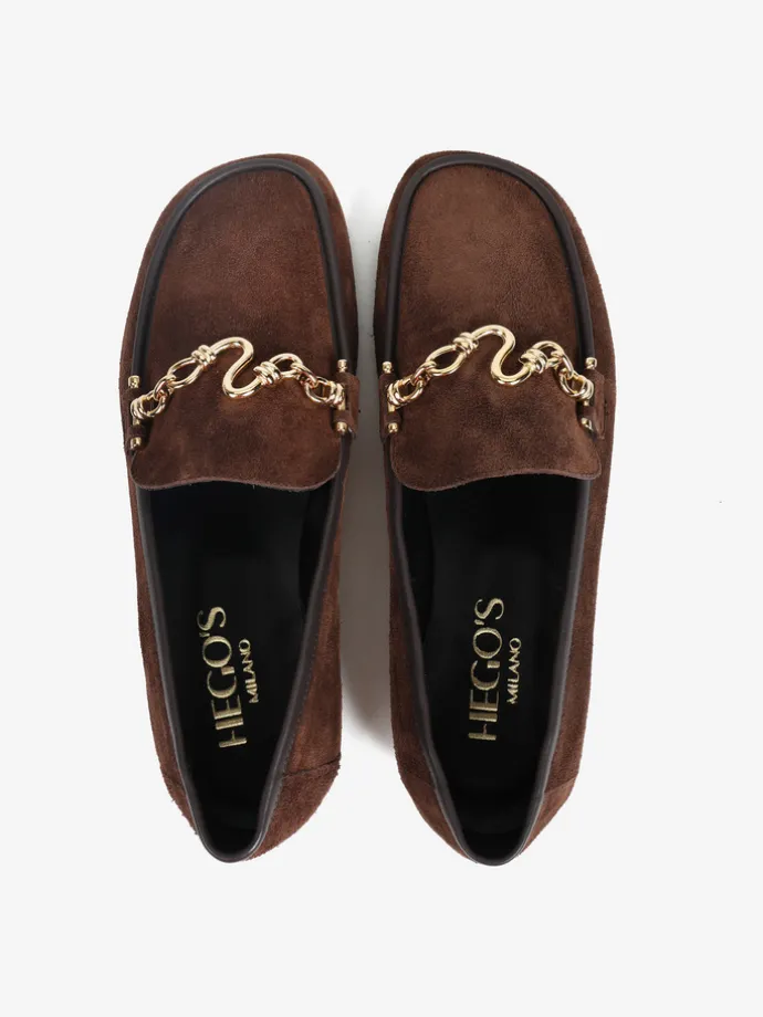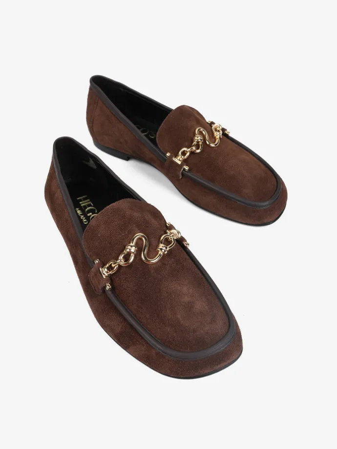 Zamszowe mokasyny z asymetrycznym noskiem i biżuteryjną aplikacją.
