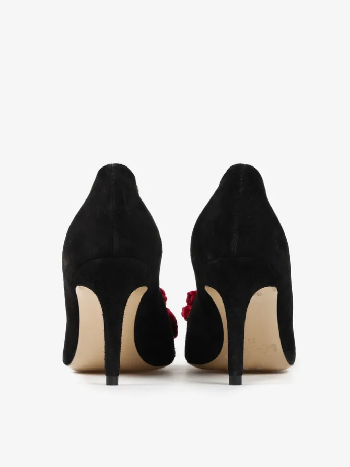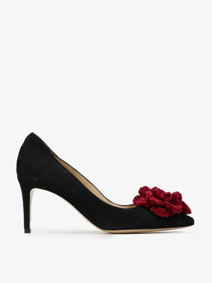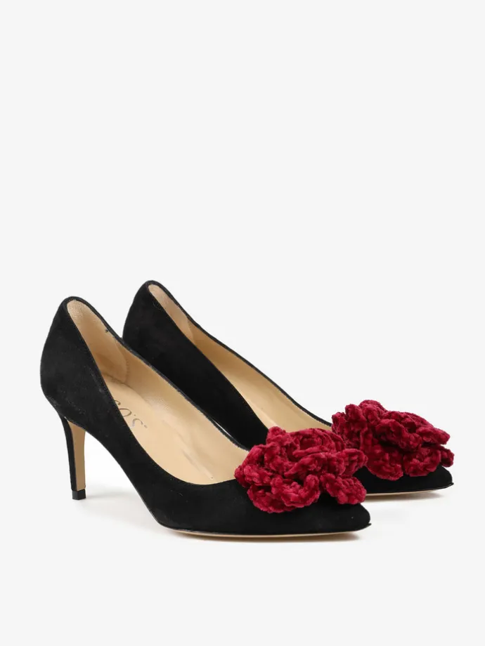 Zamszowe szpilki z noskiem w szpic ozdobione szydełkowym, bordowym kwiatem.