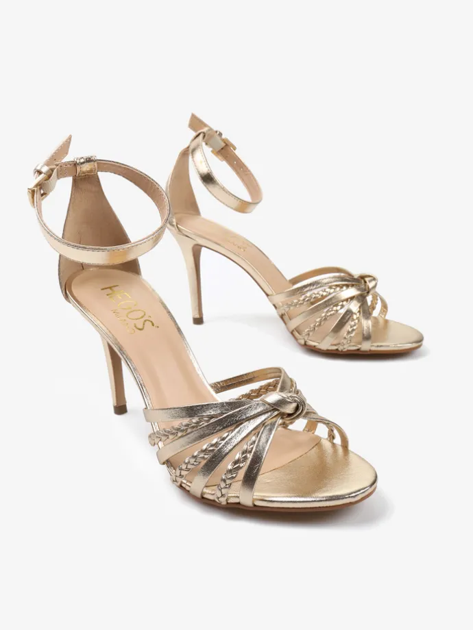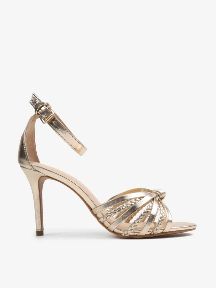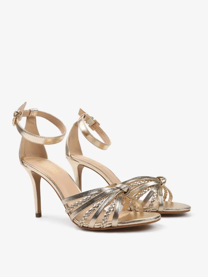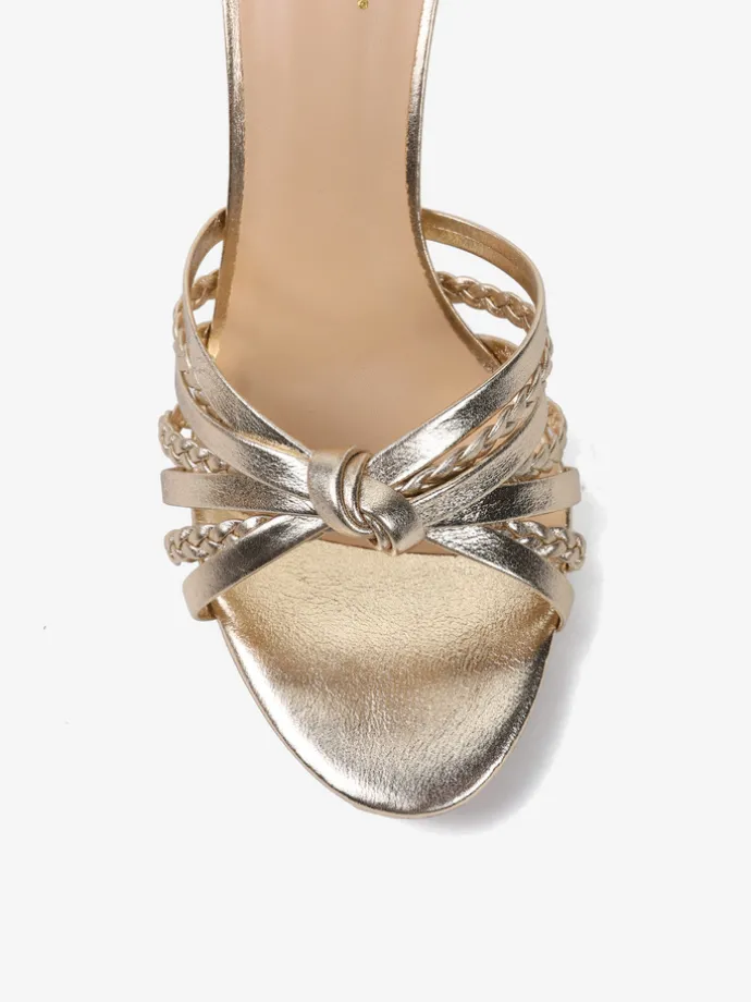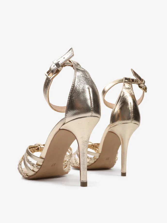 Sandały paskami z gładkiej oraz plecionej w warkocz skóry metalizowanej. Zakryta pięta i regulowane zapięcie na kostce.