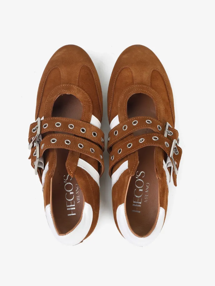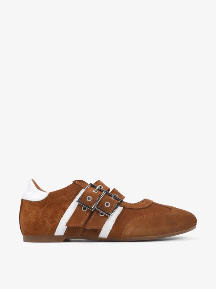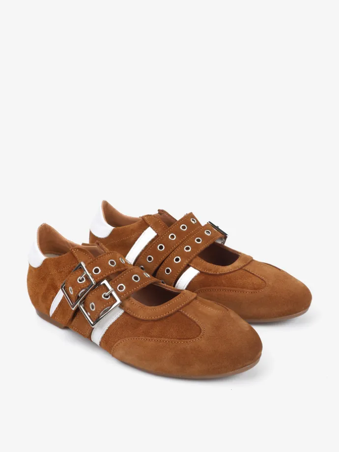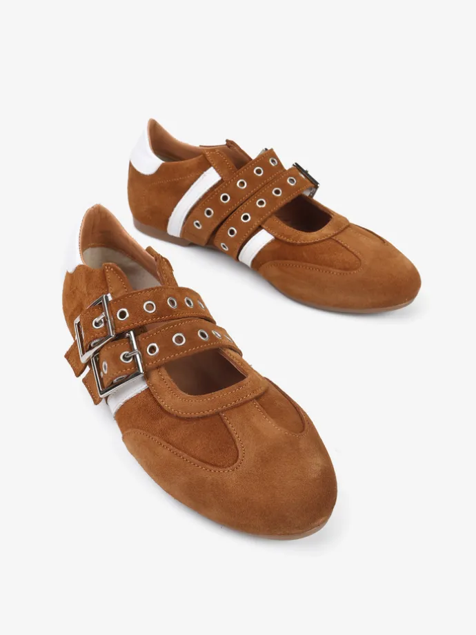 Zamszowe sneakersy z głębokim wycięciem i dwoma regulowanymi paskami. Białe przeszycia ze skóry licowej