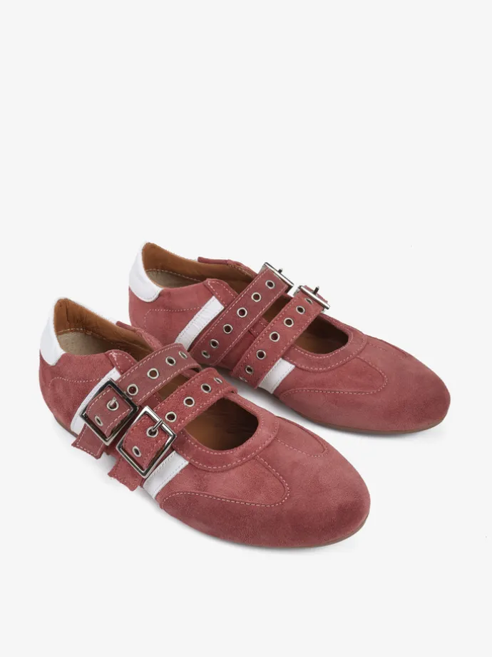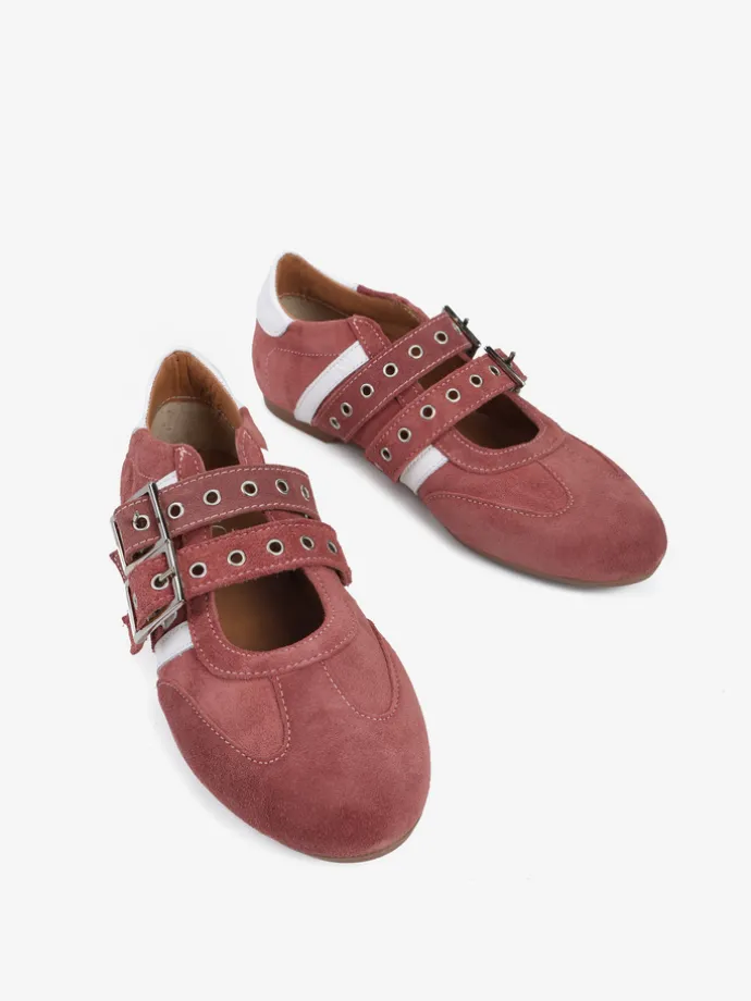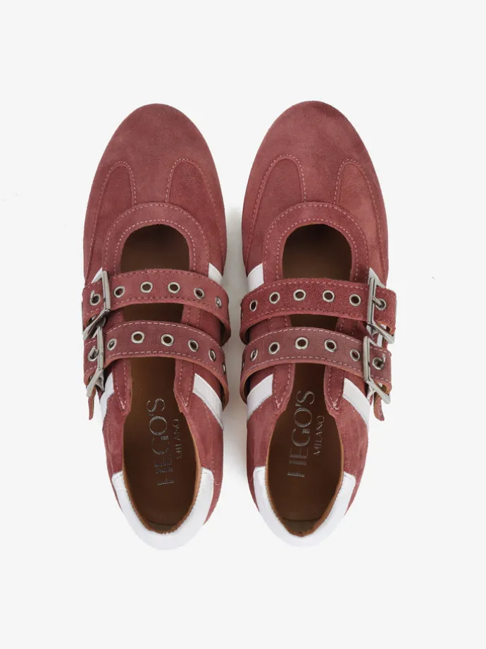 Zamszowe sneakersy z głębokim wycięciem i dwoma regulowanymi paskami. Białe przeszycia ze skóry licowej.