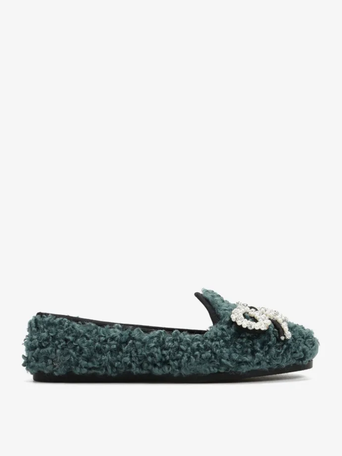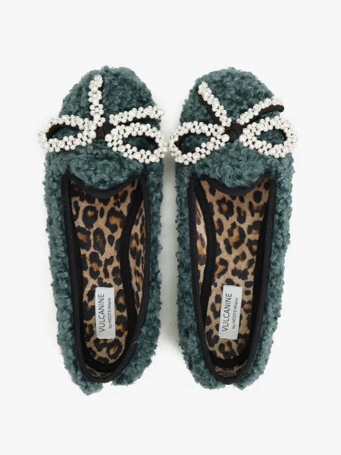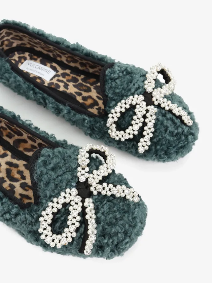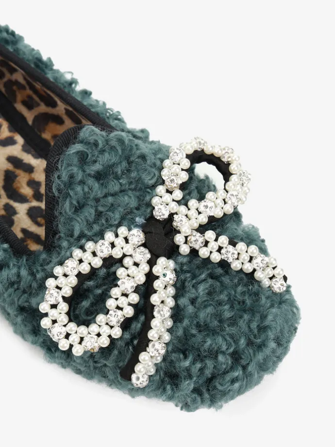 Baleriny wykonane z miękkiej tkaniny imitujacej futro baranka. Ozdobna kokarda z perełkami.