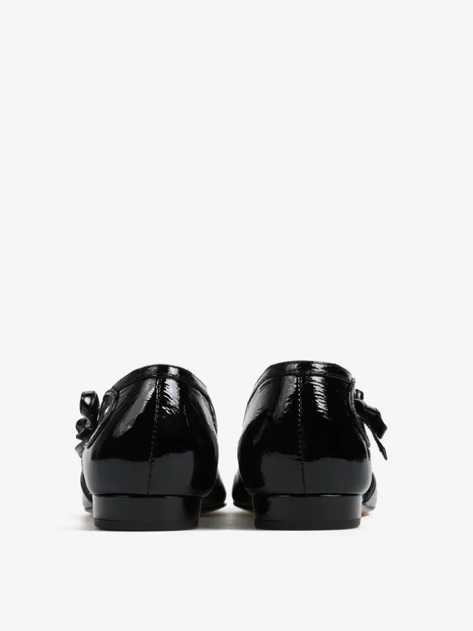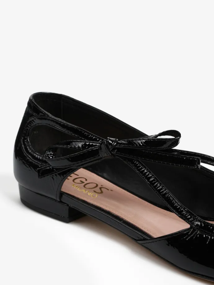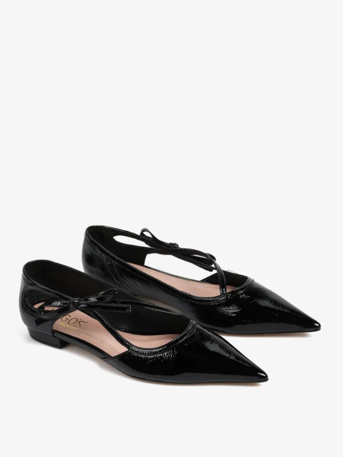 Lakierowane, czarne baleriny z noskami w szpic. Głębokie wycięcie i ozdobny pasek z kokardą.
