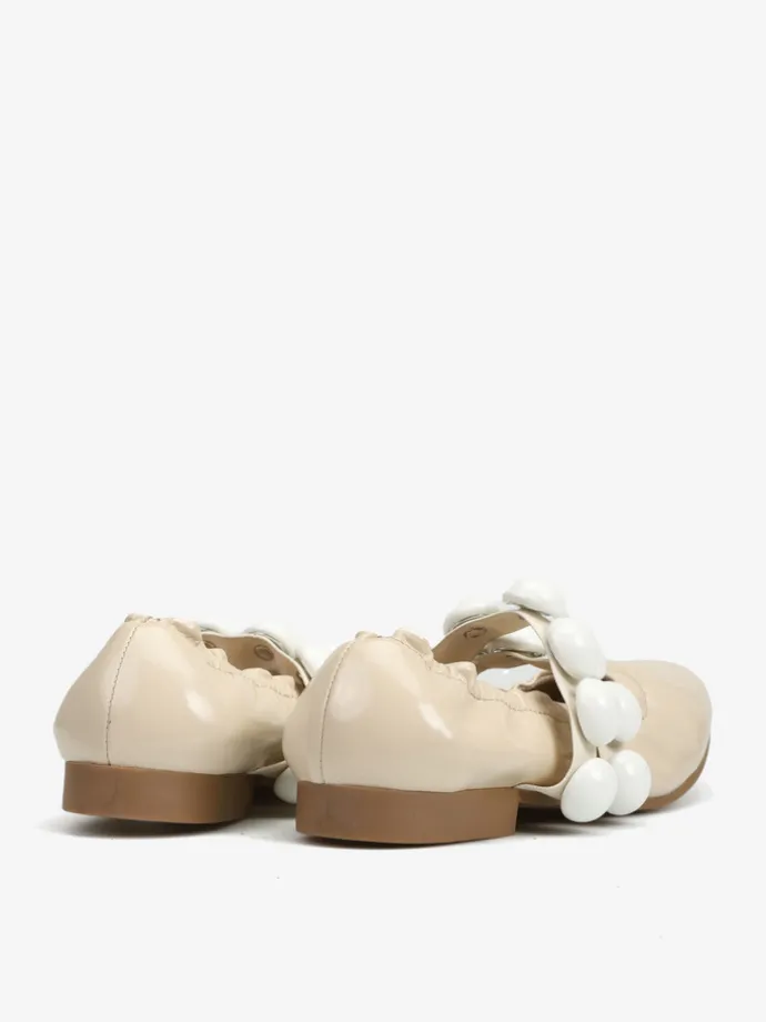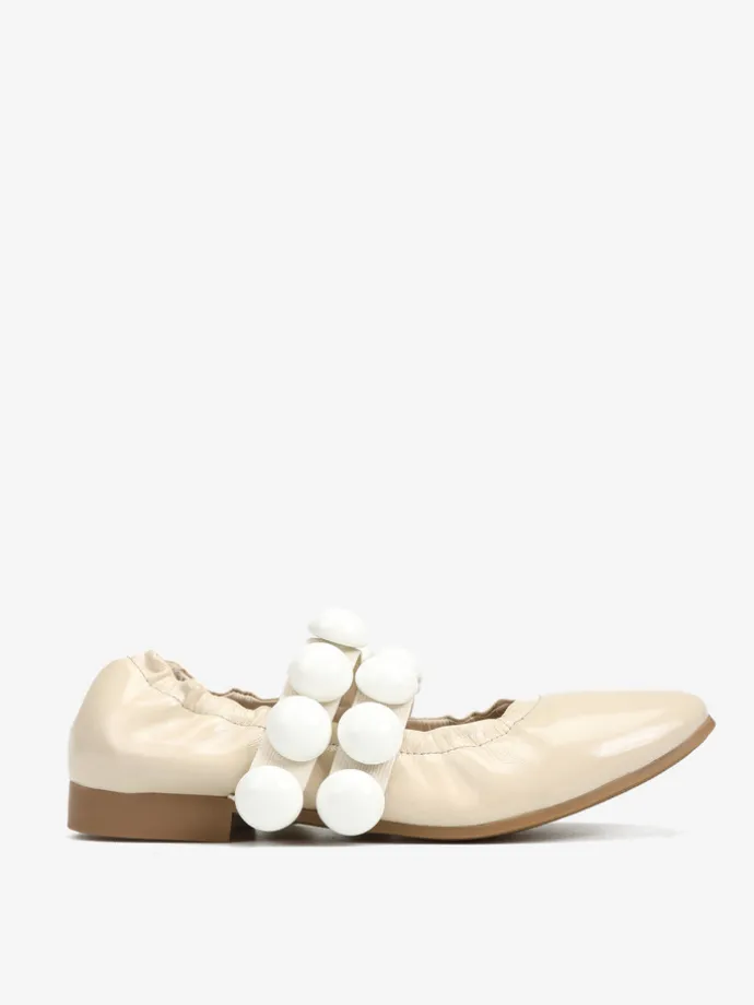 Skórzane baleriny z elastyczną lamówką. Podwójna gumka z ozdobną aplikacją na podbiciu.