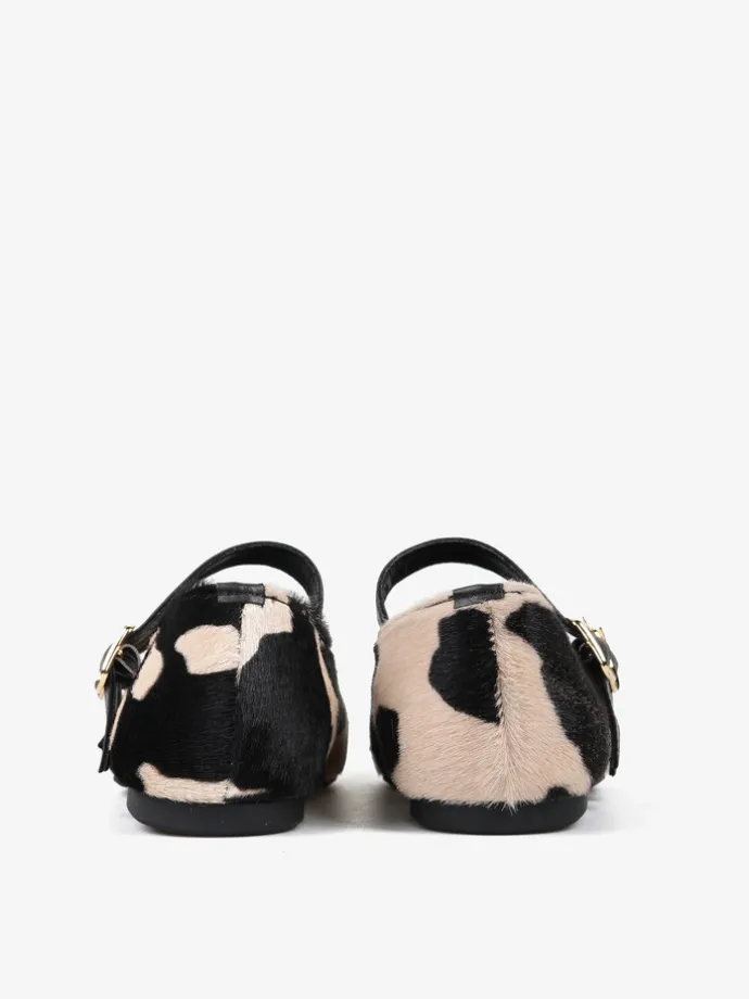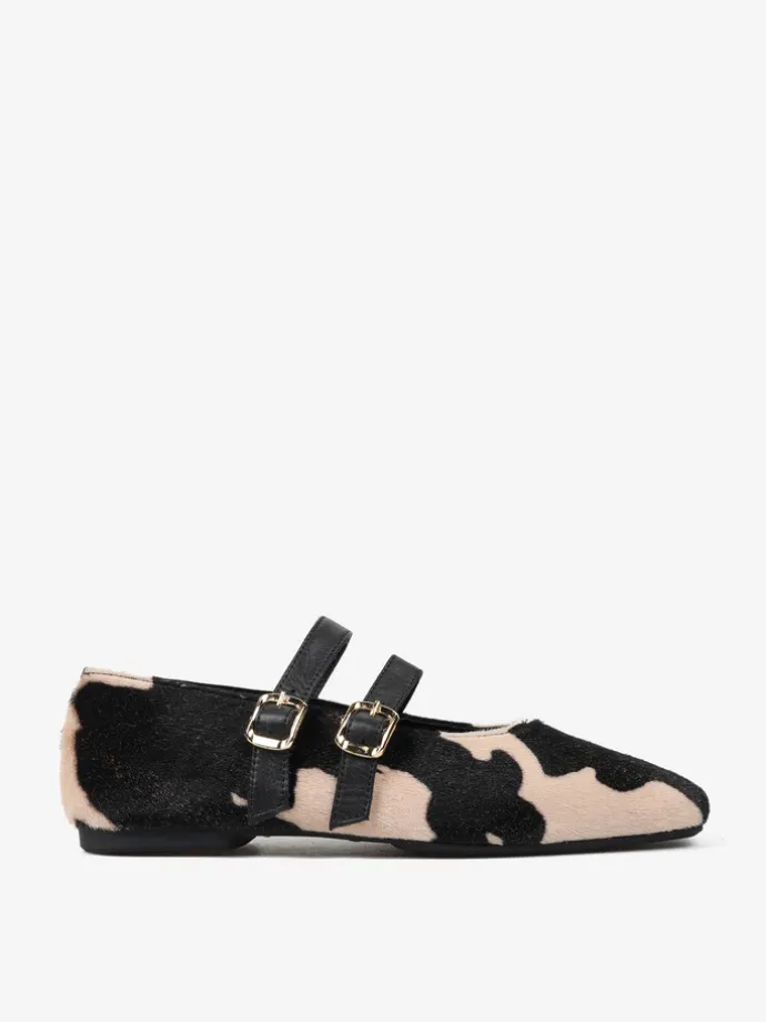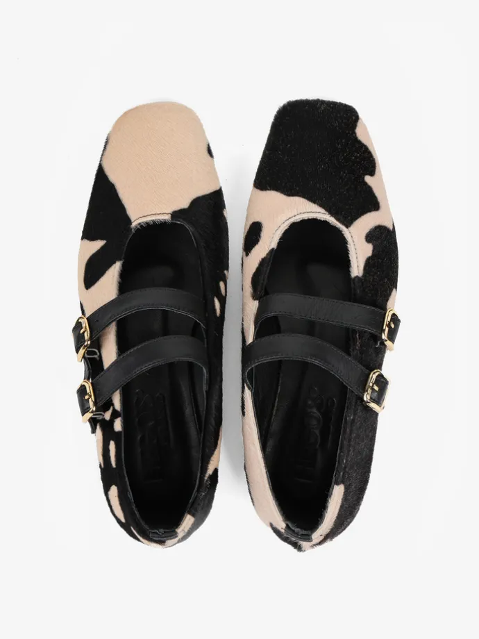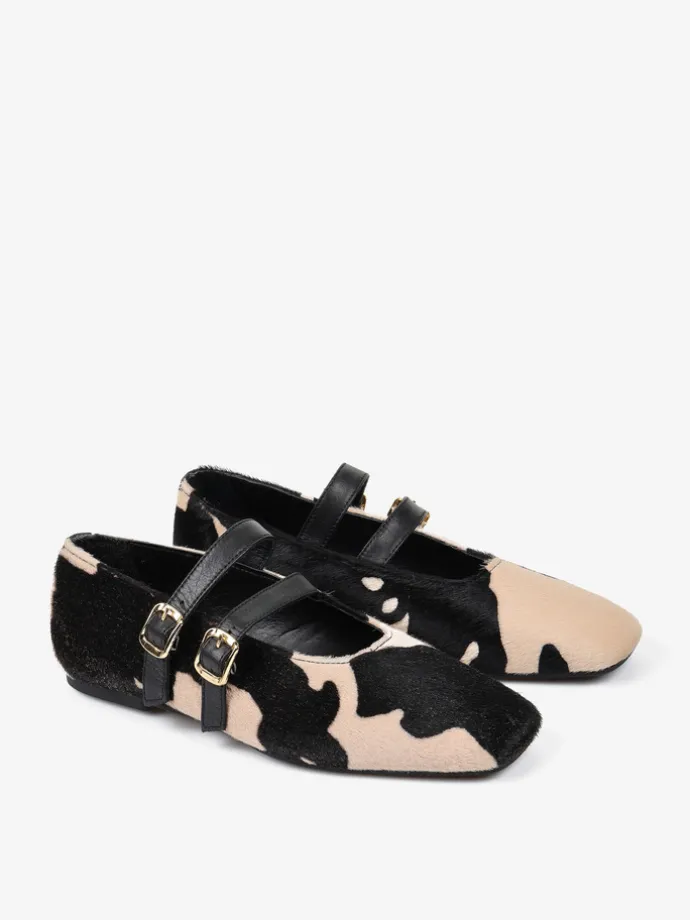 Baleriny COW PRINT z kwadratowymi noskami, wykonane ze skóry z włosiem w beżowo-czarne łaty. Regulowane paski z czarnej skóry.